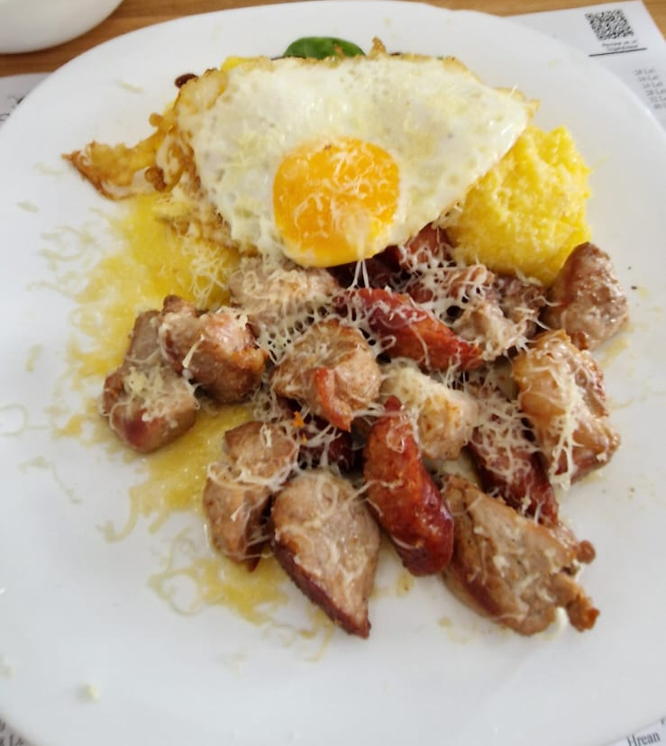 Eu am ales o ciorba de fasole boabe cu afumatură și ceapă roșie, iar la felul doi o tochitură cu mămăliguță și ou. Ciorba ți-o aduce la oală și îți pune chelnerul în farfurie până dă pe dinafară, indiferent de câte ori îi spui tu: ”Mulțumesc, este de ajuns!”. Și bine face pentru că este absolut delicioasă. Poate doar la mama acasă mai vezi ciorbă atât de bogată în ingredinete, legume și carne. Cu tarhon și ceapă roșie este un deliciu. Este atât de groasă și plină că te saturi lejer din ea, am comandat felul doi doar ca să am ce va povesti.