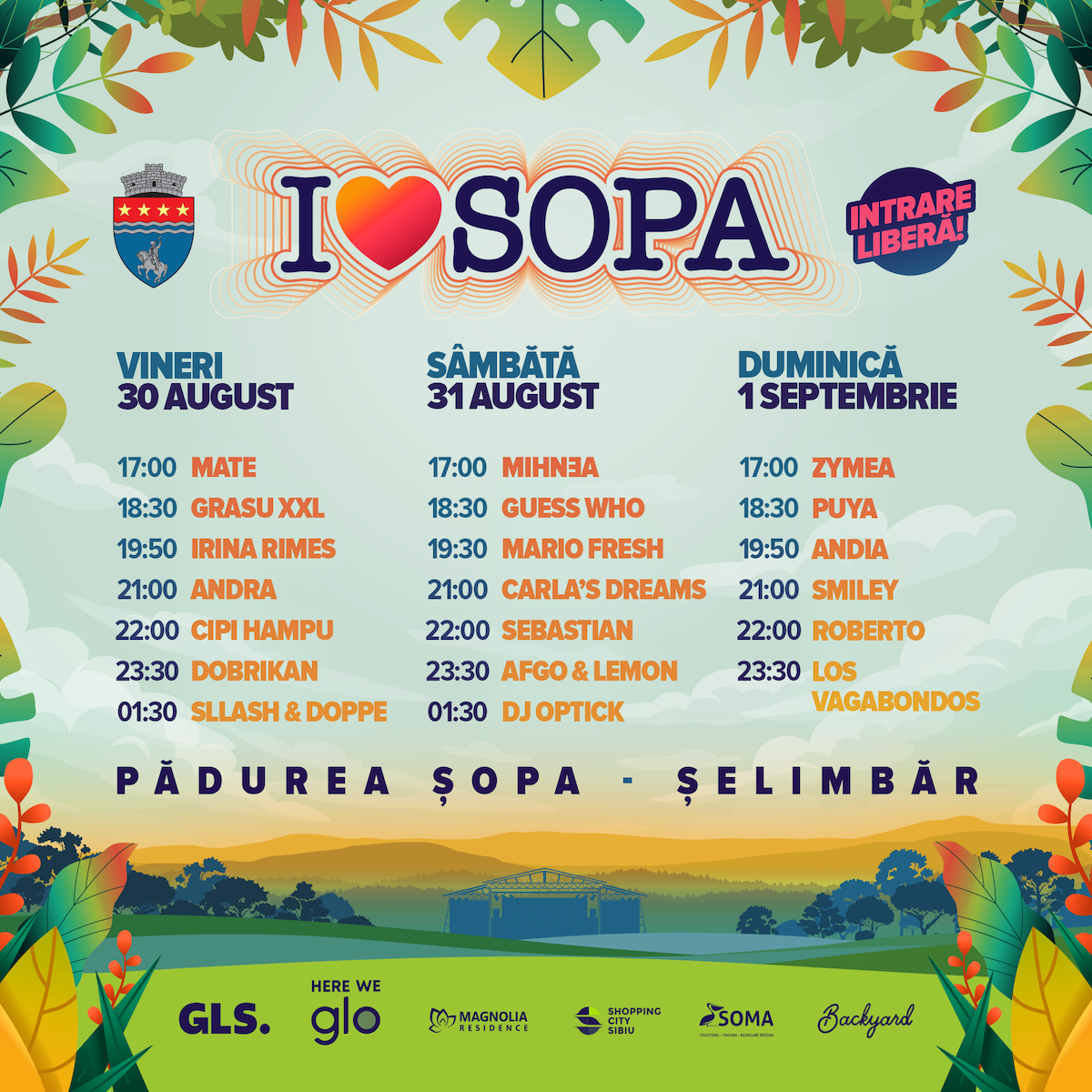 Festivalul I Love Șopa are loc în perioada 30 august - 1 septembrie. La evenimentul din Pădurea Șopa au loc concerte cu Andra, Carla's Dreams, Irina Rimes, Smiley, Andia, Grasu XXL, Puya, Mario Fresh, Guess Who și mulți alții.