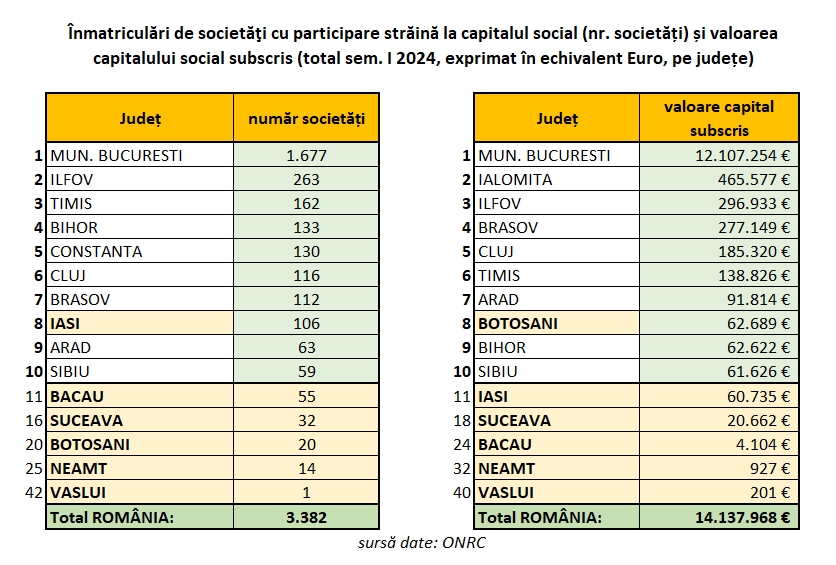 La nivelul întregii țări, valoarea capitalului social subscris în societățile cu participare străină a fost de 14.137.968 de euro, însă aproape toți bani s-au oprit în societăți din Municipiul București (12,1 milioane euro, adică 86% din total).