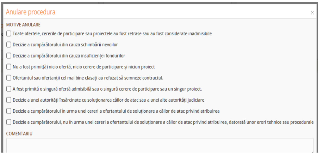 Anunțul privind anularea licitației a fost publicat în platforma de licitații publice. Motivul anulării este menționat ca fiind „Decizie a cumpărătorului din cauza schimbării nevoilor”.