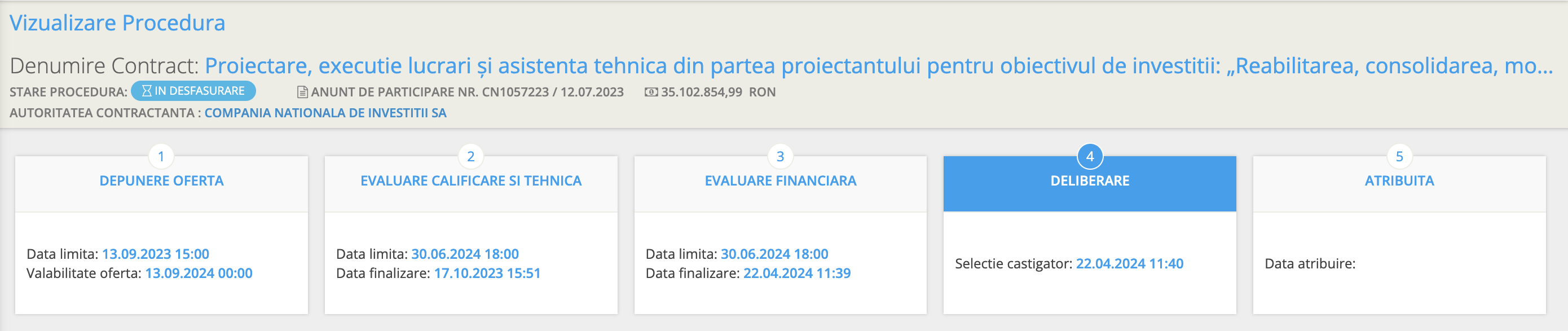 Menționăm că semnarea contractului este condiționată de limitele creditelor de angajament conform comunicării Ministerului de Finanțe Publice, pentru derularea Programului Național de Construcții de Interes Public sau Social precum și de posibilitatea aprobării unui memorandum de către Guvern, conform prevederilor art. XVII, alin. 2, din OUG 115/2023, dat fiind faptul că acest obiectiv se supune prevederilor OUG 90/2023” - se arată în răspunsul CNI.