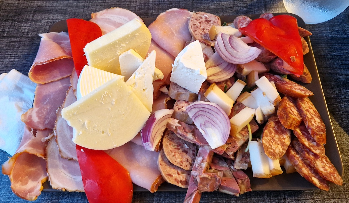 Doar că foamea a fost biruită când în față mi-a fost adus mai bine de o jumătate de kilogram de cârnați de porc, de oaie, mușchi afumat de porc, caltaboș, tobă, ruladă de porc și slănină, peste care mai erau puse câteva bucăți de telemea, brânză de burduf, o ceapă mică tăiată în patru și un ardei roșu tăiat în trei. Sincer, n-am înțeles de ce tocmai la început de toamnă, când piețele țărănești sunt la propriu încărcate de legume, pe platou nu au fost mai multe, eventual și ceva roșii dulcege... Cu atâta amar de carne în față (nimic de comentat, gustul țărănesc era acolo), n-am reușit să dovedesc foarte mult din platoul adus în față (unul sigur pentru mai multe persoane), așa că restul am cerut la pachet.