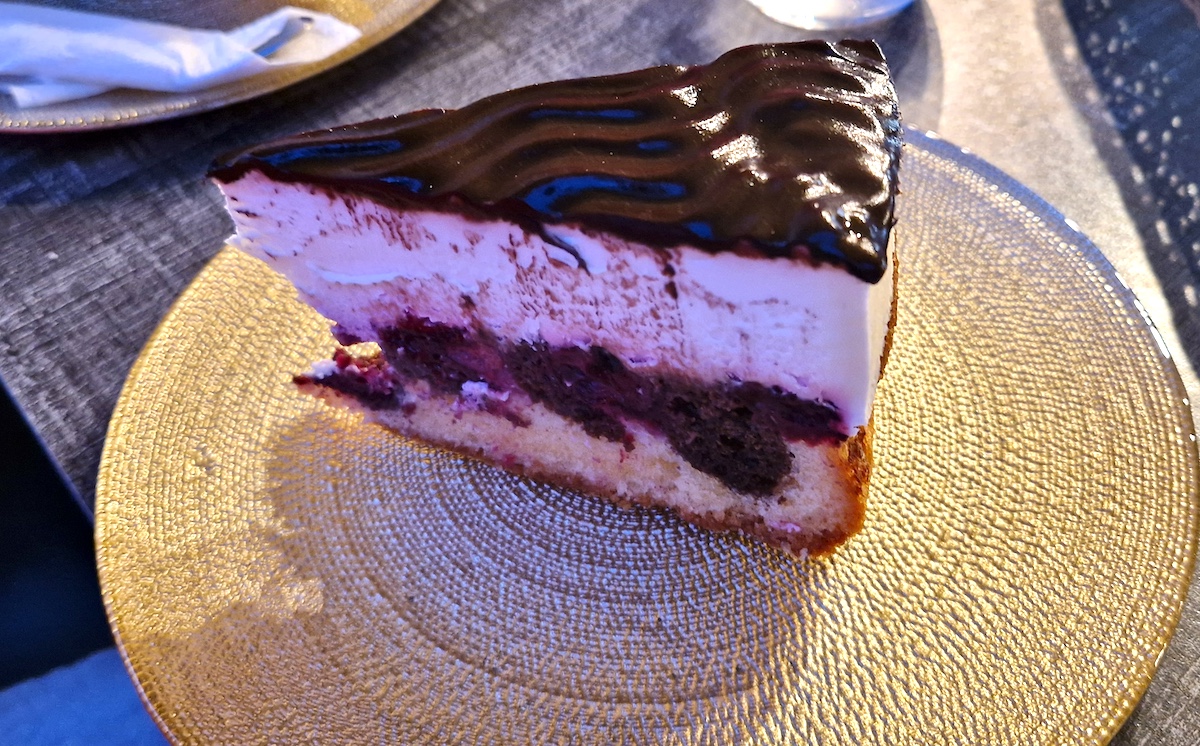 Pentru a mai stinge din gustul cepei cu care am mai tăiat din avalanșa de carne, am zis să încercăm și un desert, care era promis a fi făcut în casă. Câte o felie de tort cu fructe de pădure „valurile Dunării”. Nu a fost cea mai interesantă experiență dulce, dar n-am lăsat nimic în farfurie.