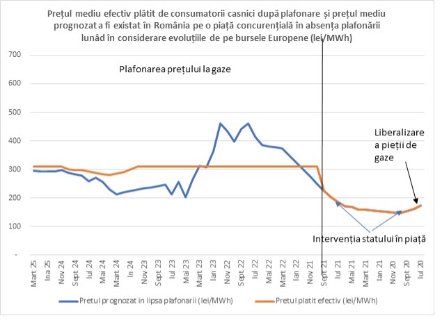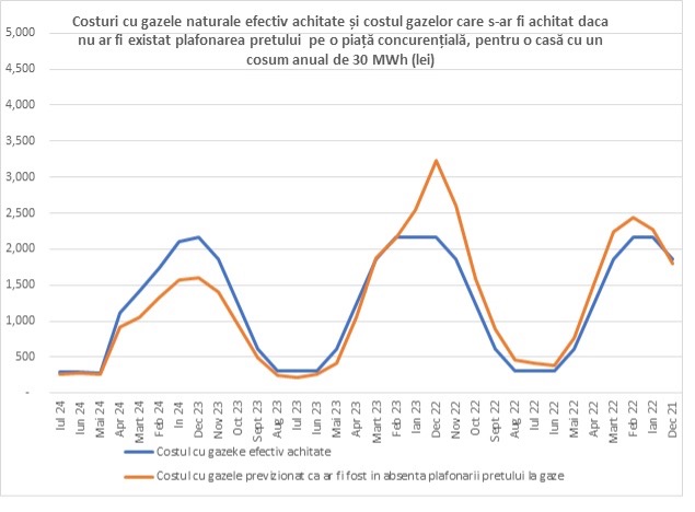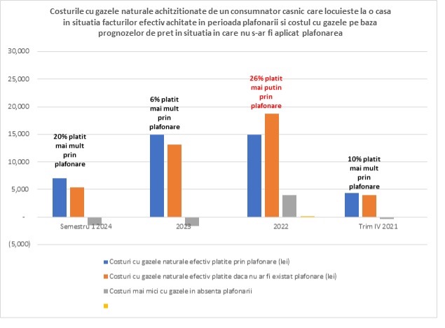 Asociația precizează că plafonarea a determinat costuri mai mici în anul 2022 estimate a fi cu până la 26% (pentru o casă), față de prețurile care s-ar fi achitat în lipsa plafonării, în celelalte perioade de plafonare prețurile achitate de consumatori estimăm că au fost mai mari decât în situația în care nu ar fi existat plafonarea, respectiv consumatorii au achitat mai mult cu 10% în Trim IV 2021, 6% în anul 2023 și 20% în Semestrul I 2024.