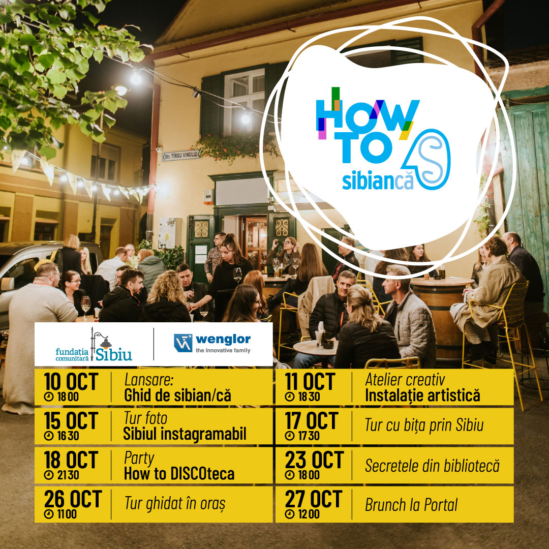 How to sibian/că revine în acest an cu cea de-a 3-a ediție și se va desfășura într-un nou format. Dacă la primele 2 ediții, activitățile s-au desfășurat în decursul unei săptămâni, evenimentul din 2024 se va întinde pe parcursul lunii octombrie și va aduce nu mai puțin de 8 experiențe pentru comunitatea sibiană. How to sibian/că, un eveniment dospit de Fundația Comunitară Sibiu (FCS) cu sprijinul wenglor, va avea loc între 10-27 octombrie, în mai multe locații din oraș și din județ.