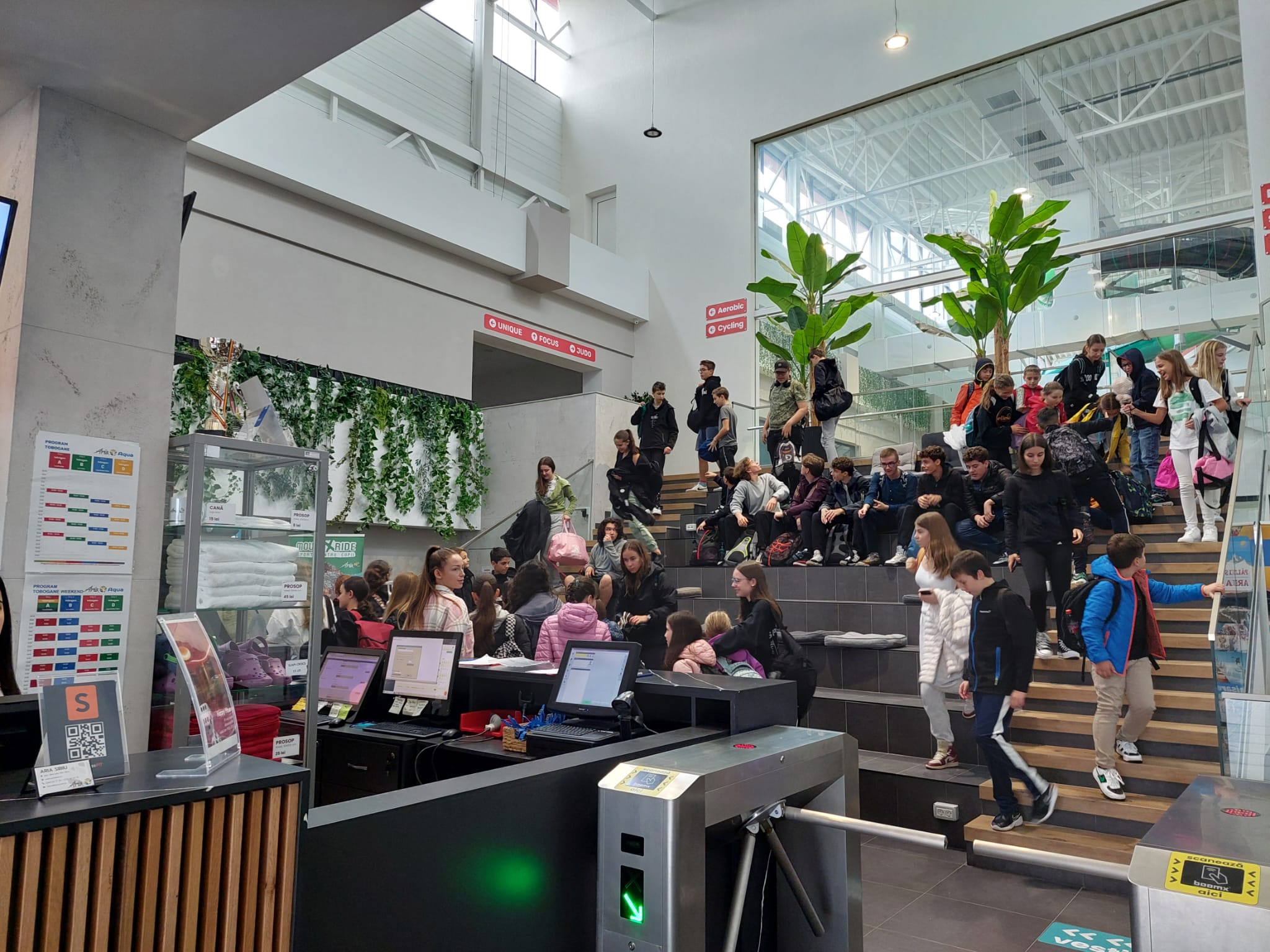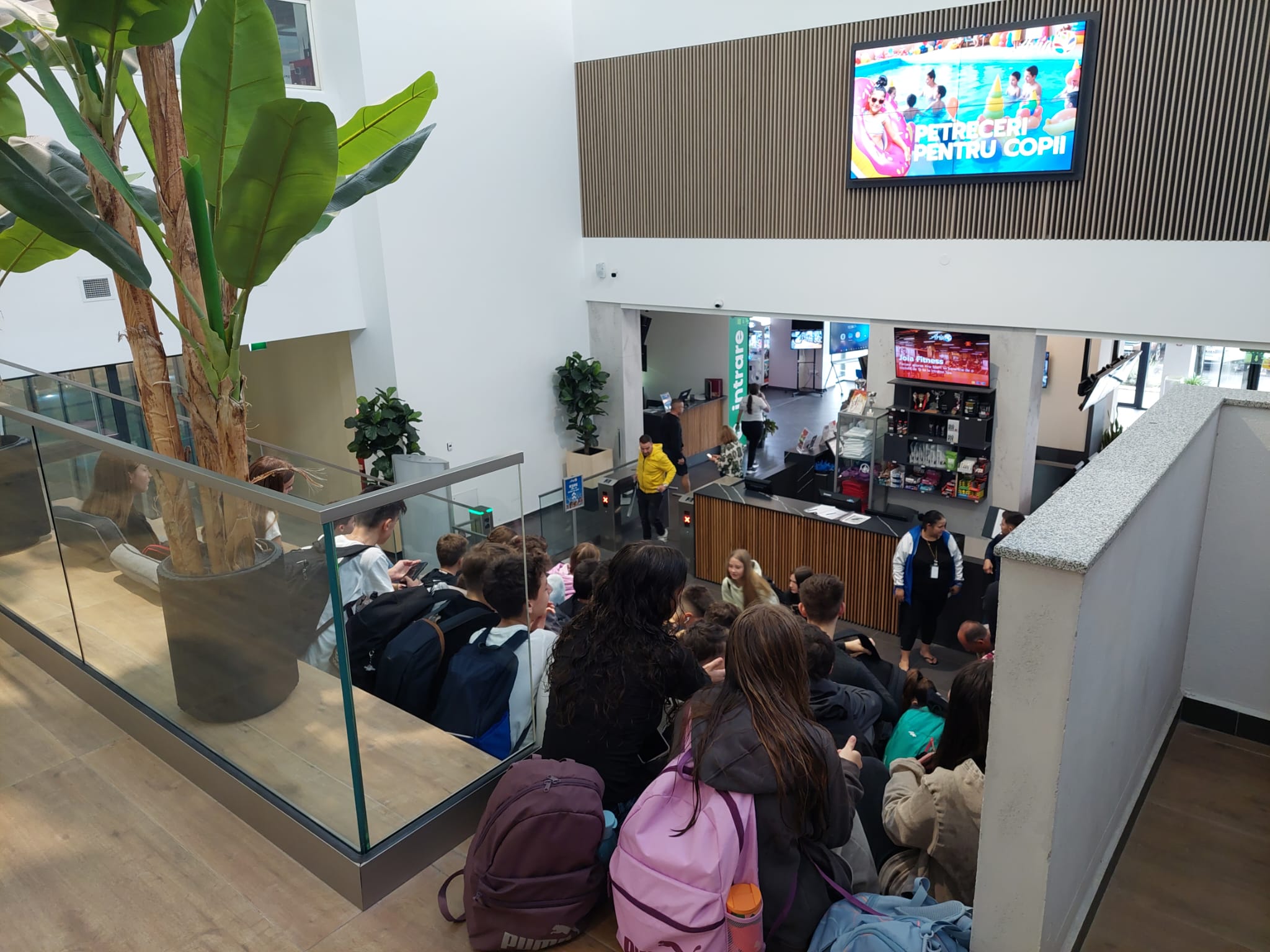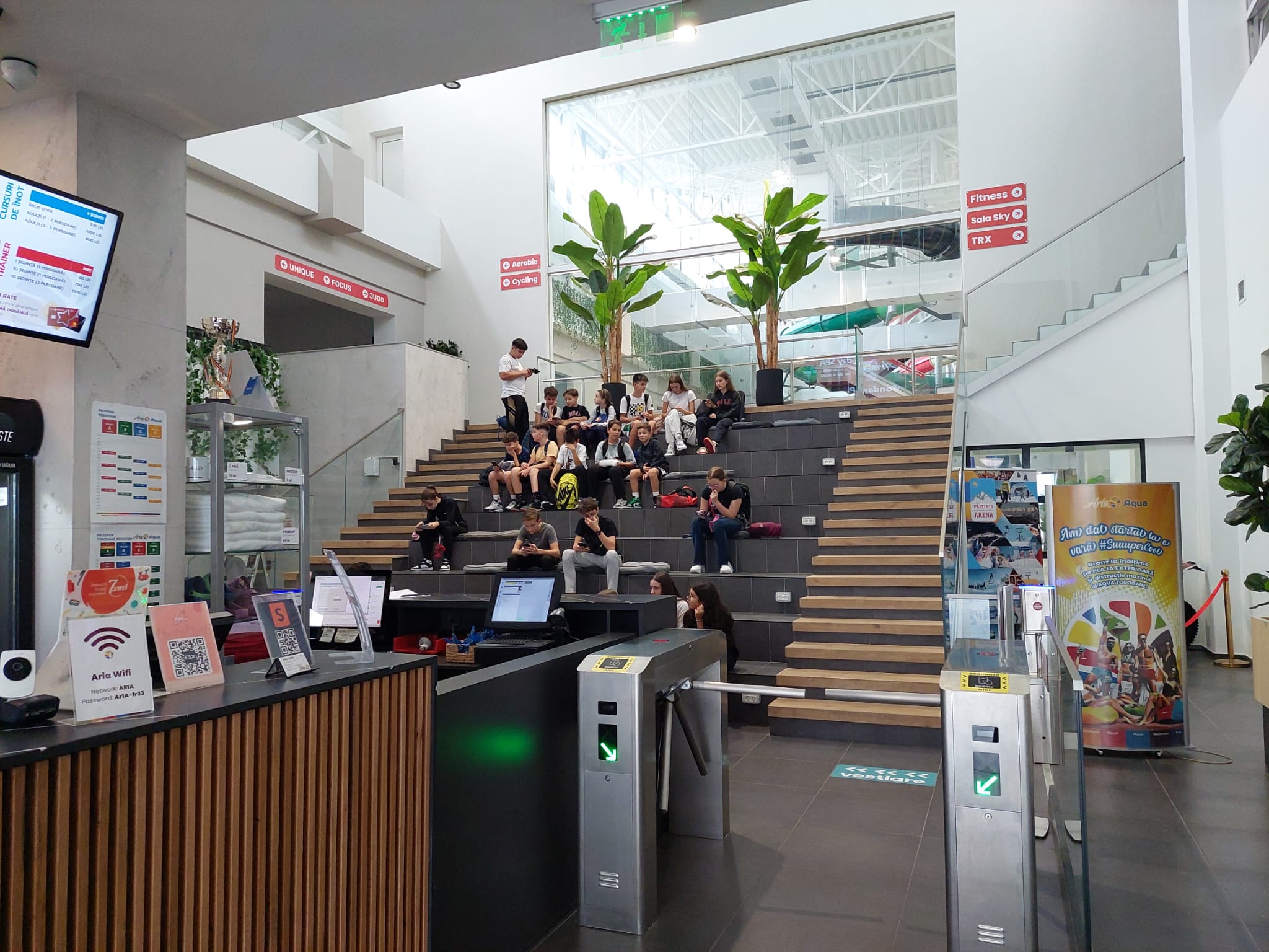 Imediat cum intri în clădirea celor de la Aria, în dreapta de recepție, este un mic amfiteatru. Acolo se adună elevii care urmează să intre la piscine, în timp ce tura precedentă este pe ultima sută de metri cu îmbrăcatul și uscatul.