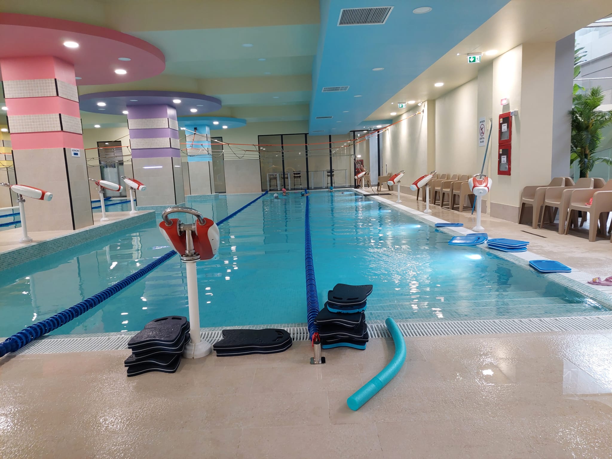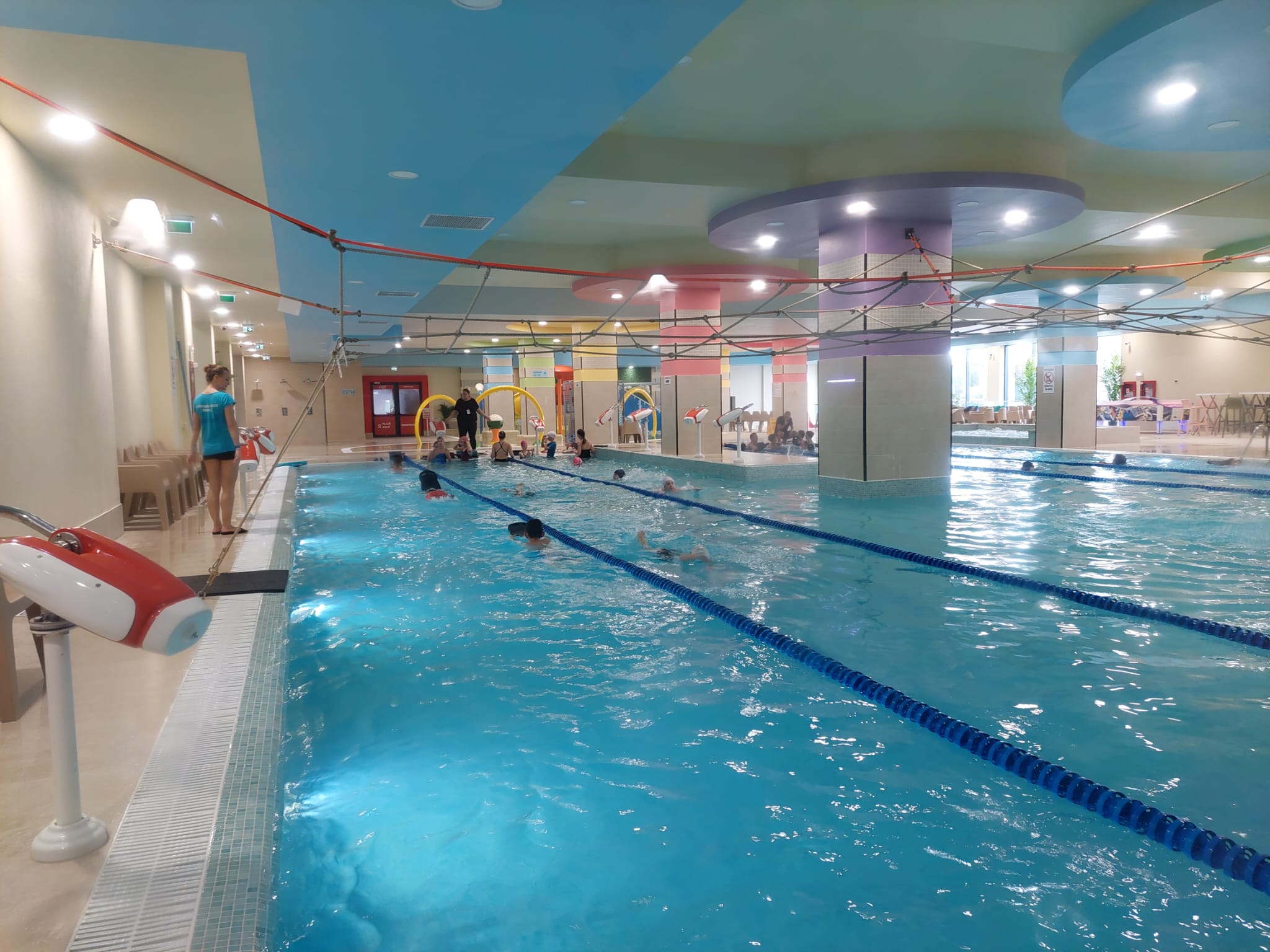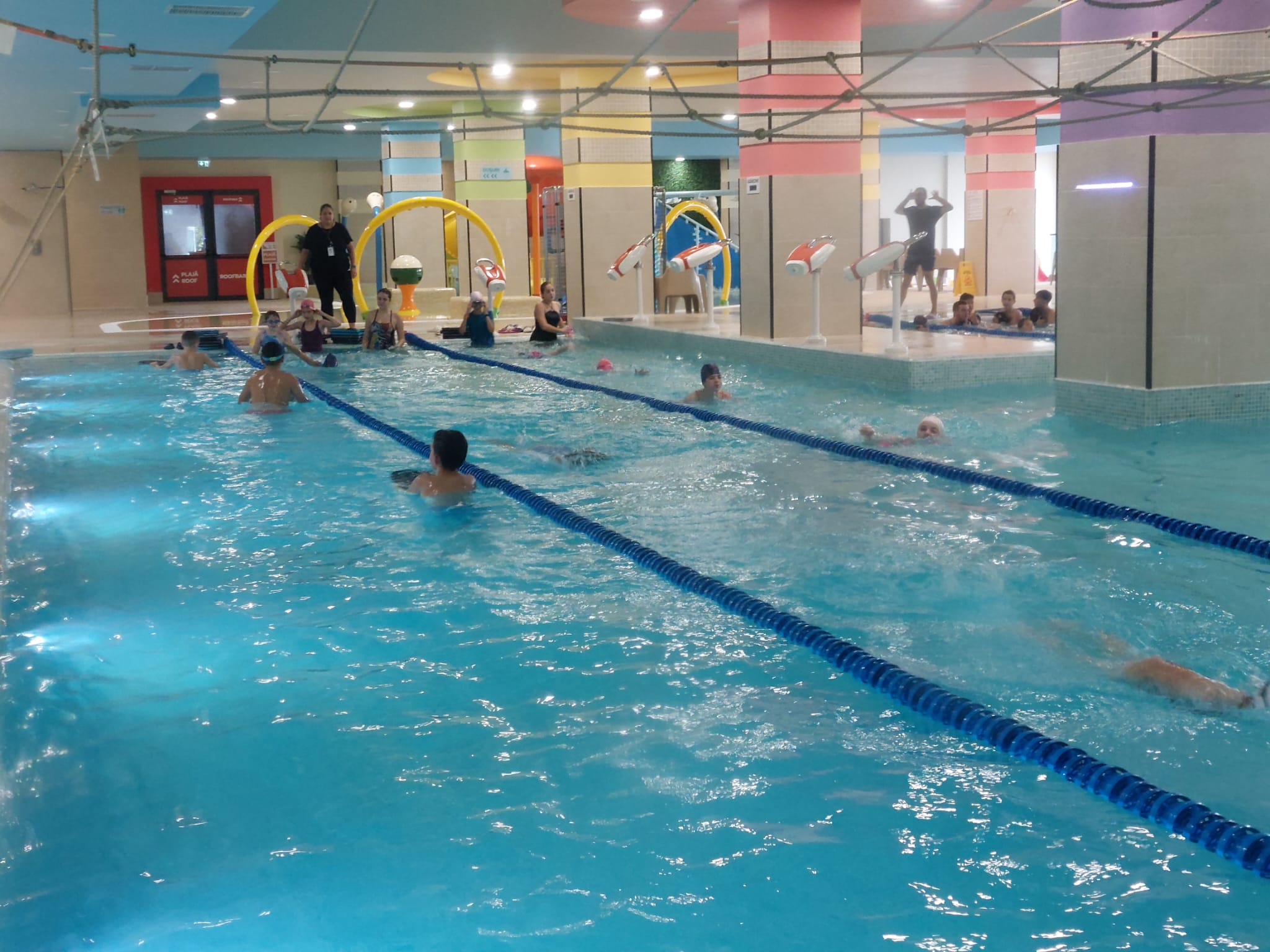 Alături de copii sunt supraveghetori, instructori și profesori de înot. Bazinele sunt împărțite în șase culoare, special pentru elevi. Pe primele sunt copiii care nu știu deloc să înoate și apoi merg pe nivel de cunoștințe, până la cei mai buni înotători care sunt pe ultimul culoar. Bazinul are de la un metru douăzeci adâncime, până la un metru și patruzeci de cm.