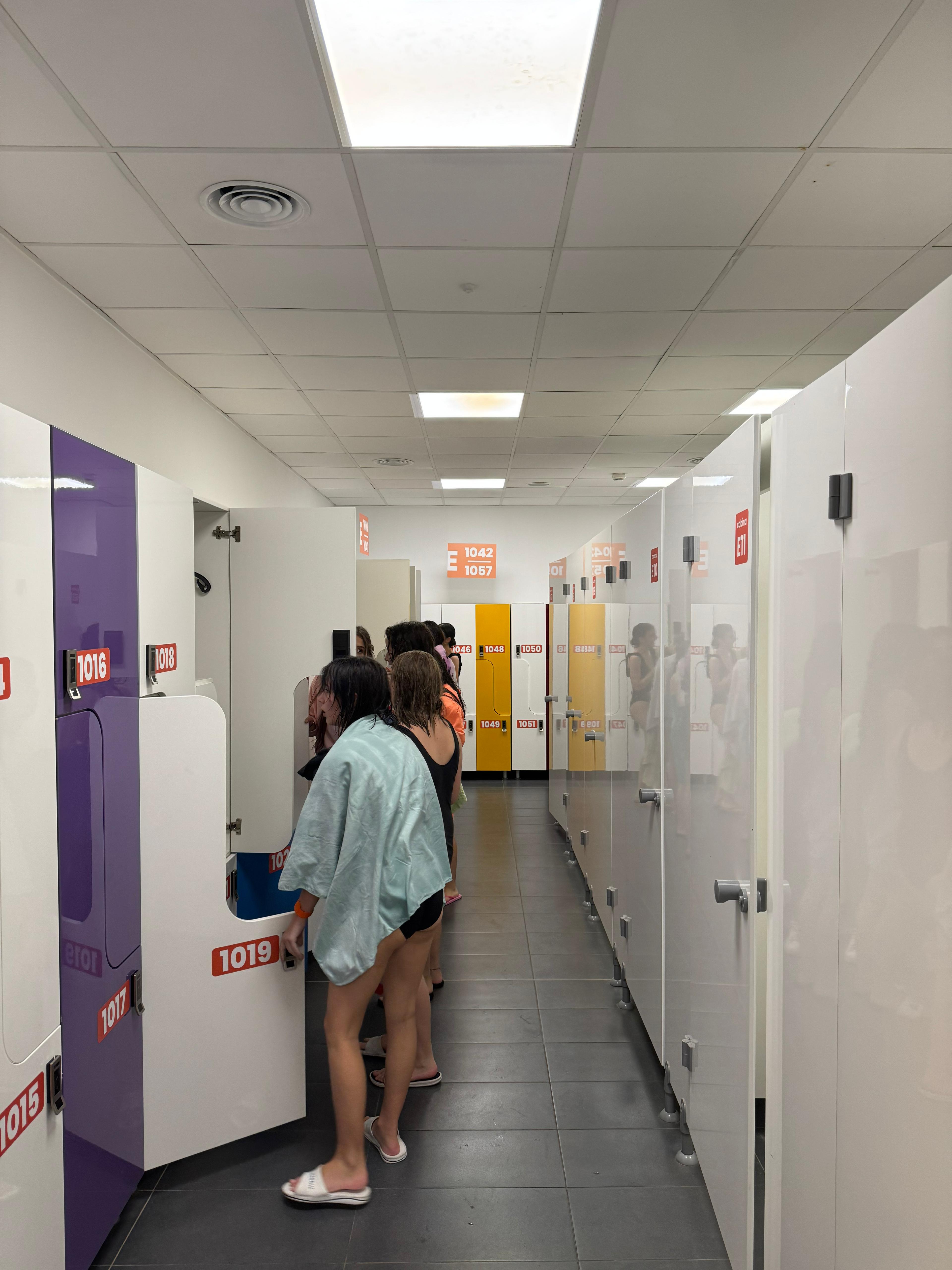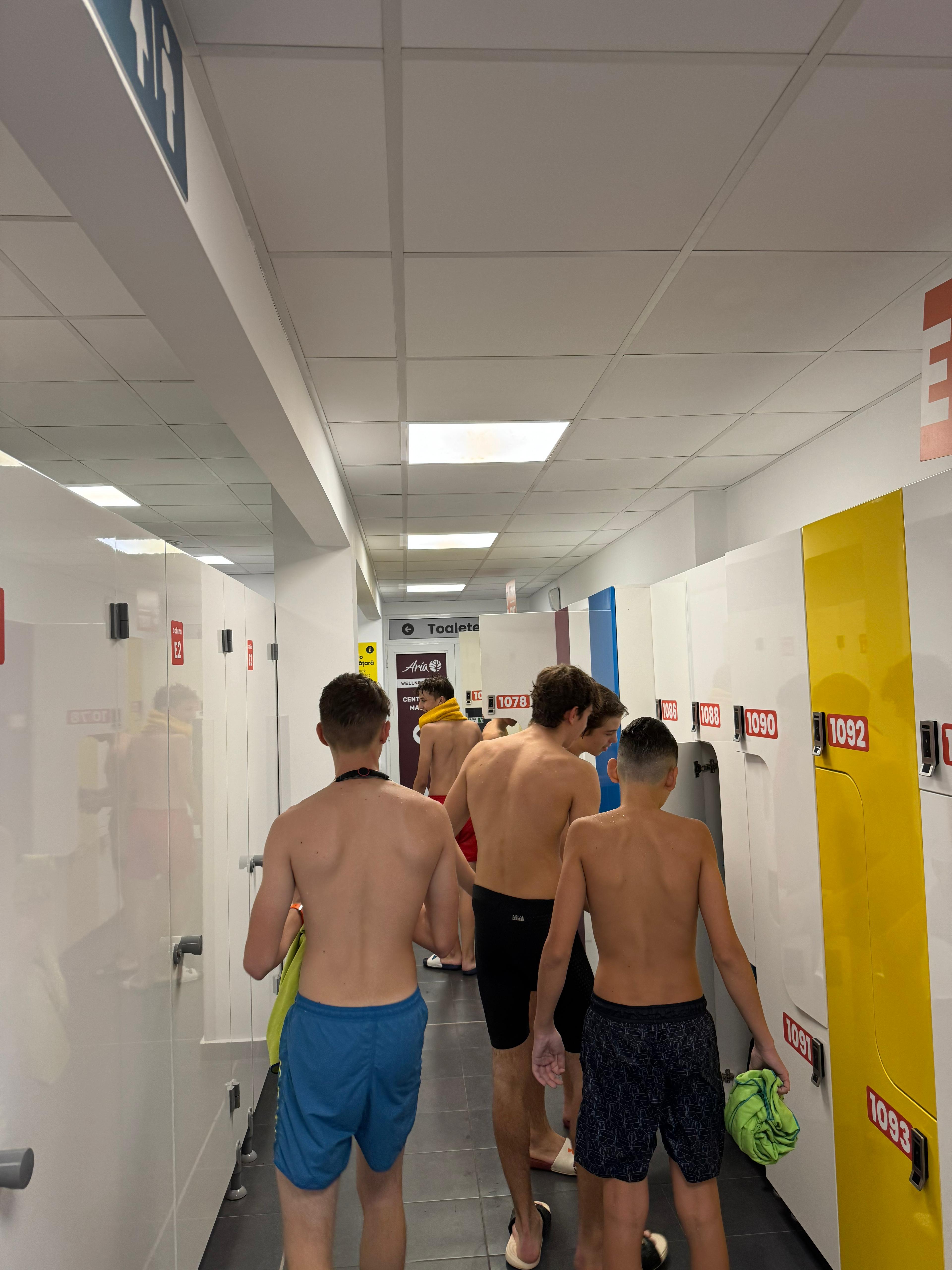 Andrei explică faptul că vestiarele sunt împărțite în patru zone, delimitate de panglici care indică direcțiile. Două zone sunt alocate fetelor, care intră prima dată și se schimbă, iar alte două sunt alocate băieților care intră ulterior.