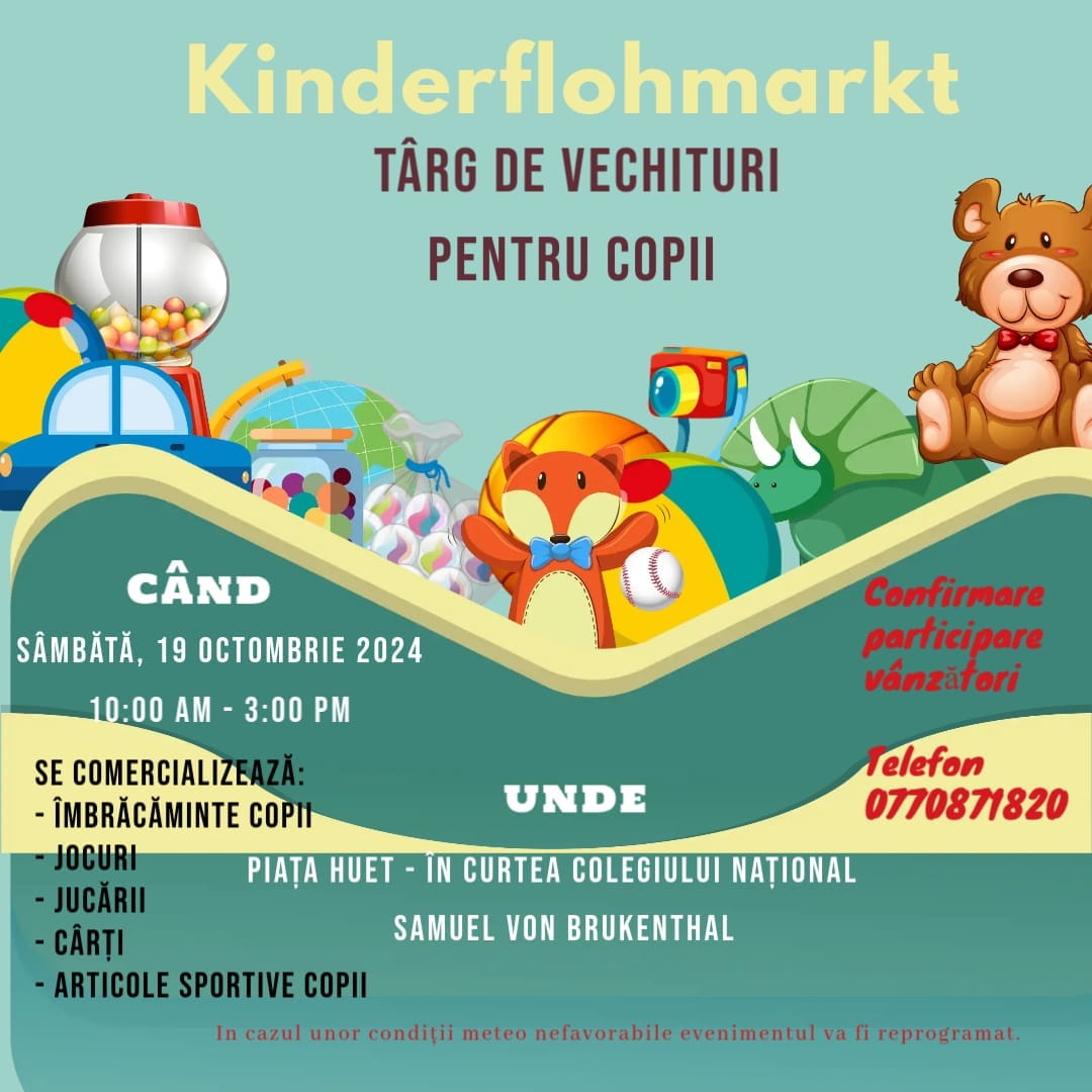 Kinderflohmarkt-ul de toamnă va avea loc sâmbătă, 19 octombrie, orele 10 – 15, în Piața Huet, în curtea Colegiului Național "Samuel von Brunkenthal".