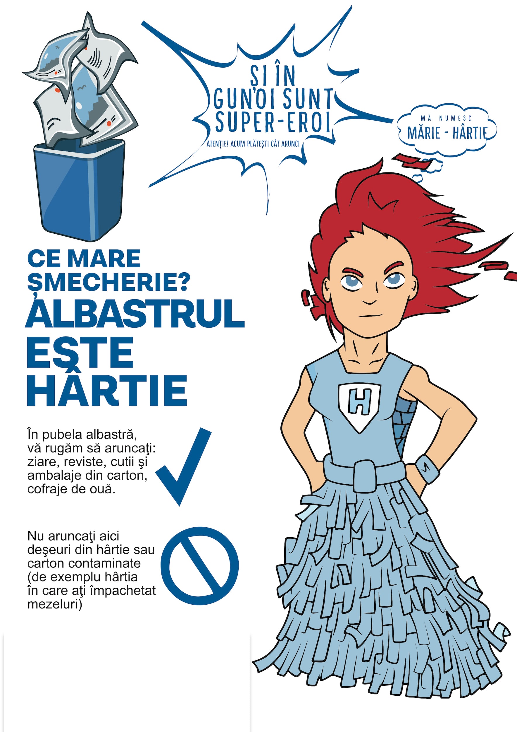 Mărie-hârtie este super-eroul care, la Sibiu, este responsabil de deșeurile din hârtie și carton. Deșeuri care trebuie depozitate în recipientele de culoare albastră.