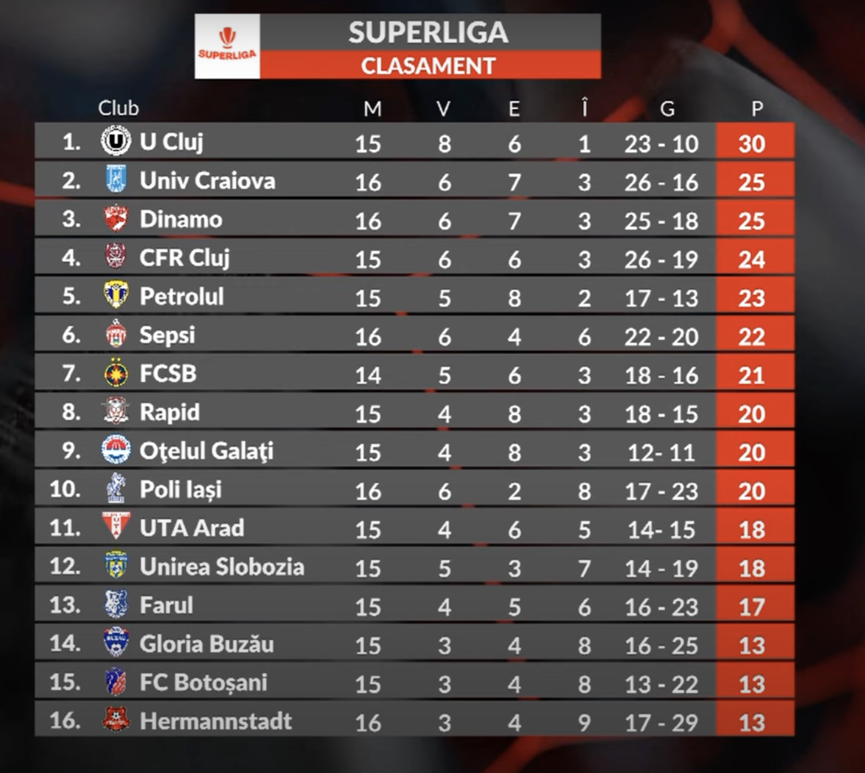 Și în fotbal urmează o pauză competițională de două săptămâni, în care, cel mai probabil, vor fi luate mai multe decizii. FC Hermanstadt se află pe ultima poziție a clasamentului cu 13 puncte, față de U. Cluj care se află pe prima poziție cu 30 de puncte.