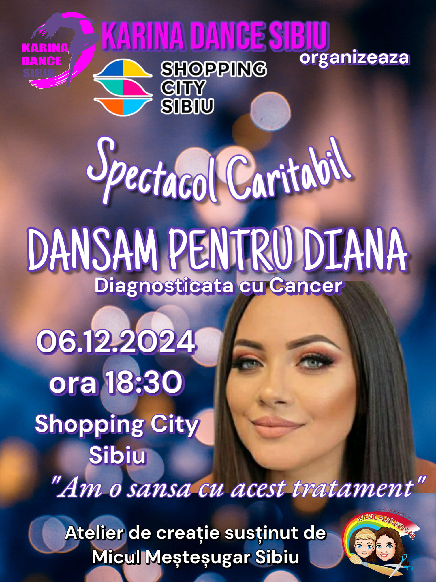 Karina DANCE SIBIU și Shopping City Sibiu organizează un spectacol caritabil - "Dansăm pentru Diana" - cu scopul de a susține șansa la viață a unei mămici minunate, diagnosticată cu o formă severă de cancer.