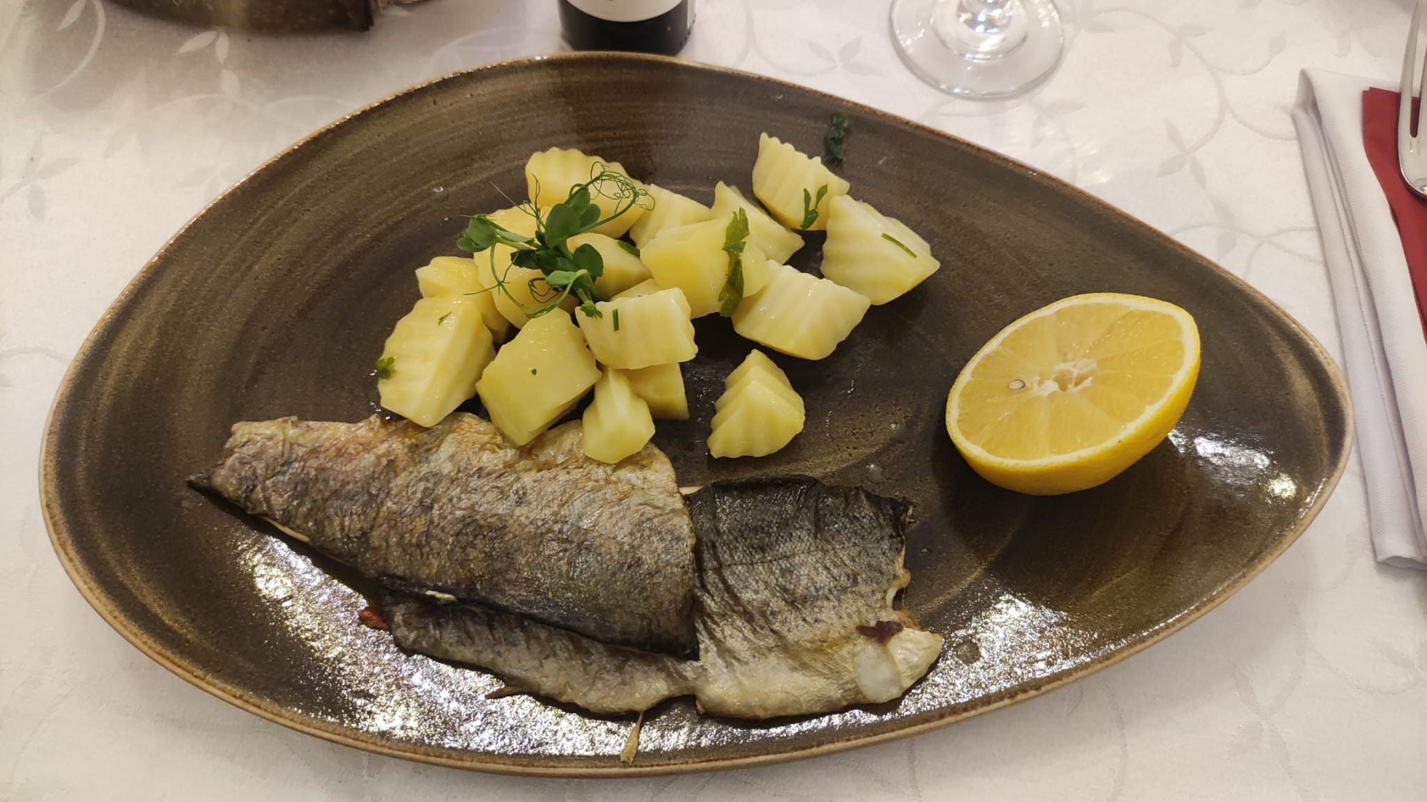 Ca prezentare, farfuriile nu le-aș duce la vreun concurs de gastronomie: garniturile erau puse lângă pește, așa, ca să umple golul. Vinul, în schimb, a fost bun.
