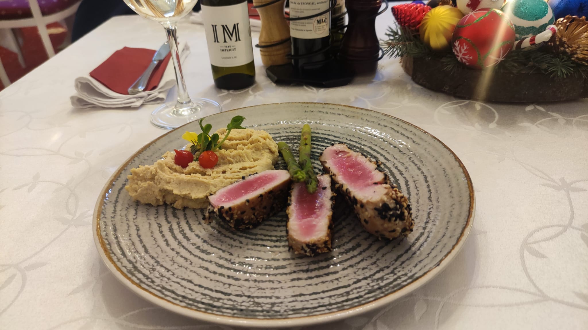 După o așteptare de aproximativ jumătate de oră, am primit o farfurie cu trei bucăți de ton foarte frumoase, „învelite” într-o crustă generoasă de susan și însoțite de năut și două fire de sparanghel. Cât am mâncat, am căutat să înțeleg gustul, să înțeleg ce mănânc. Nimic: nici gust, nici miros. Singurul gust era cel dat de susan. Tonul are un gust și un miros specific, de aceea nu este pe placul tuturor. Oricât am încercat să simt peștele din acele bucăți de un roz frumos, n-am reușit; am eșuat, năuc, cu gura plină.