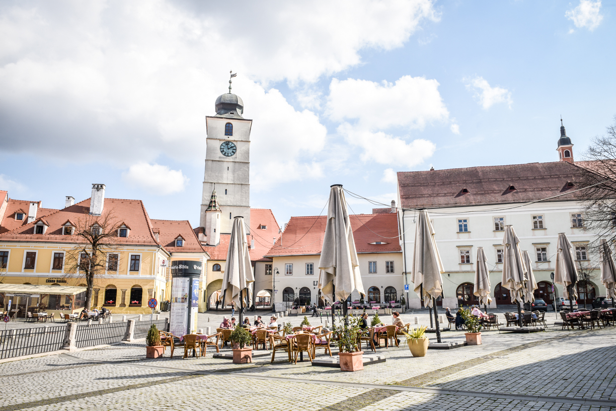 Terasele din Sibiu vor putea fi extinse și acoperite doar cu umbrele de mici dimensiuni. Sursa foto: Turnul Sfatului