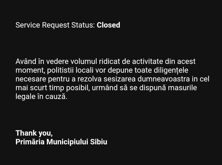 La sesizarea făcută, însoțită de fotografii ale mașinilor parcate pe trotuar, reprezentanții Primăriei Sibiu spun că polițiștii locali se confruntă cu un volum ridicat de activitate.