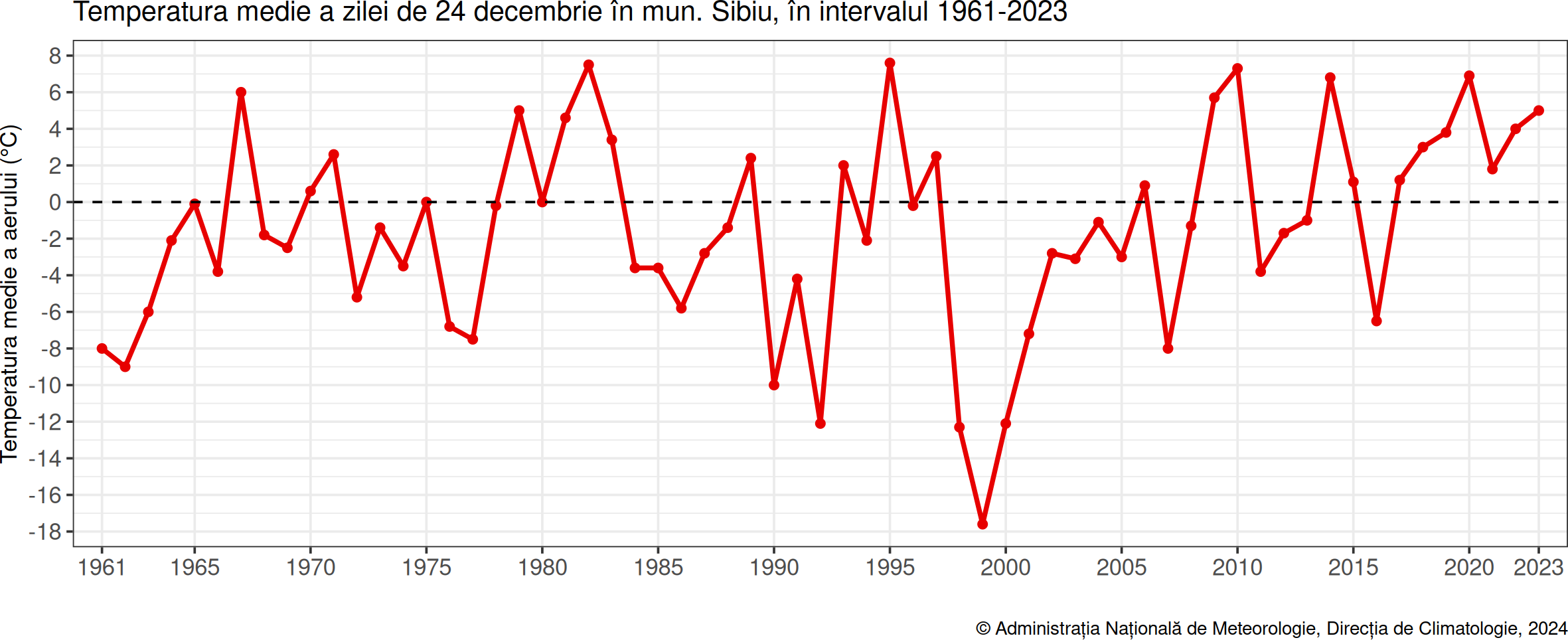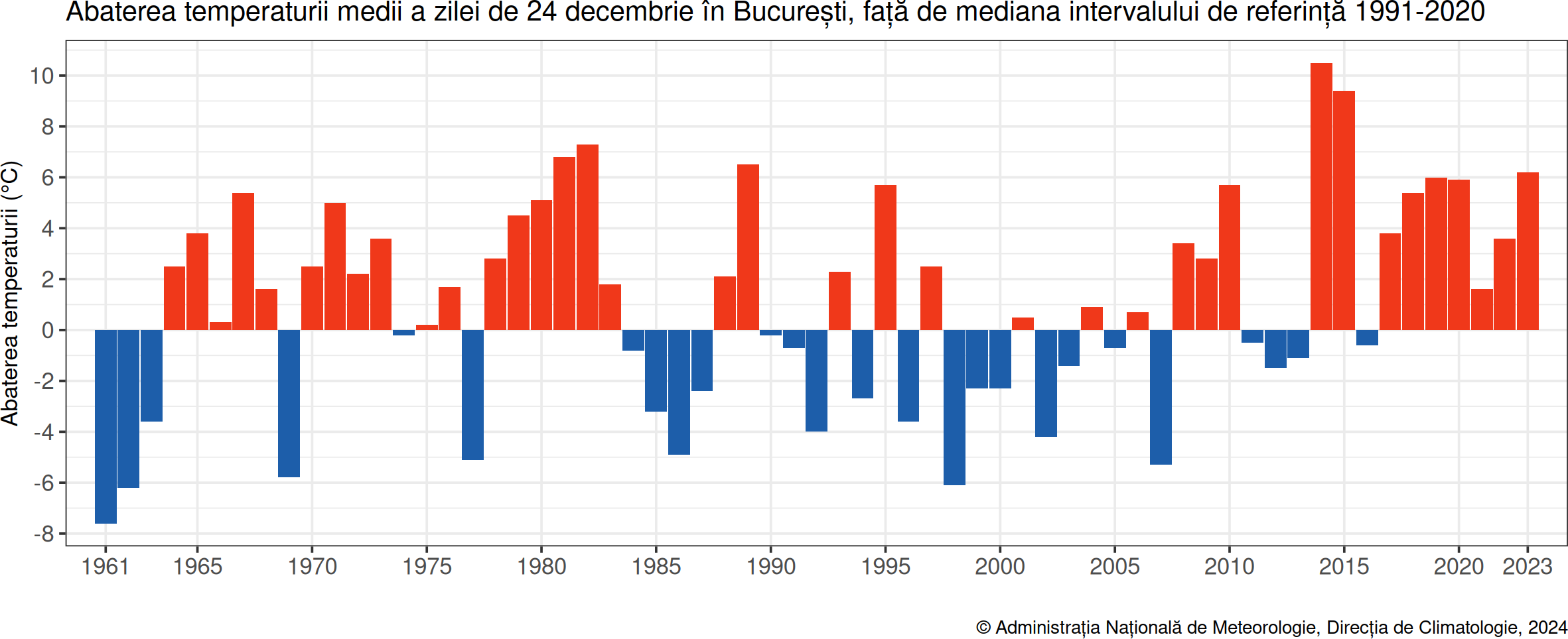 În ultimii 20 de ani, în 14 ani abaterea de la temperatura medie a fost pozitivă, asta însemnând că a fost mai cald decât de obicei. Cel mai mult a fost în 2010, când în Ajunul Crăciunului a fost mai cald cu 9 grade față de media zilei.