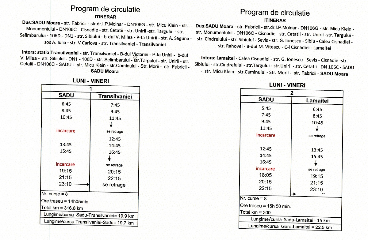 Cel mai devreme, autobuzele vor pleca din Sadu la 05:45, iar cel mai târziu se vor întoarce din Sibiu la 23:10 (ora de plecare din municipiu). „35 de minute durează o cursă din Sadu până în Sibiu, asta pe traseul prin cartierul Arhitecților”, spune primarul Valentin Ivan, care declară că a ținut ca traseele din Sadu să traverseze și cartierul Arhitecților.