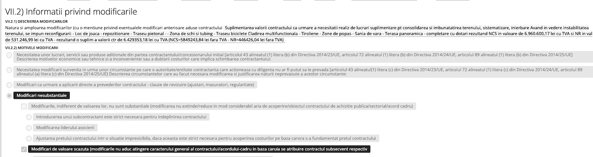 Potrivit anunțului, printre reconfigurările care se impun este mutarea locului de joacă, dar și completarea cu dotări a unei terase panoramice prevăzută în proiect. Ca urmare a acestor modificări, rezultă lucrări suplimentare în valoare de 6,96 de milioane de lei, cu tot cu TVA. Schimbările determină și renunțarea la anumite investiții, a căror valoare este calculată la puțin peste 531.000 de lei, cu tot cu TVA.