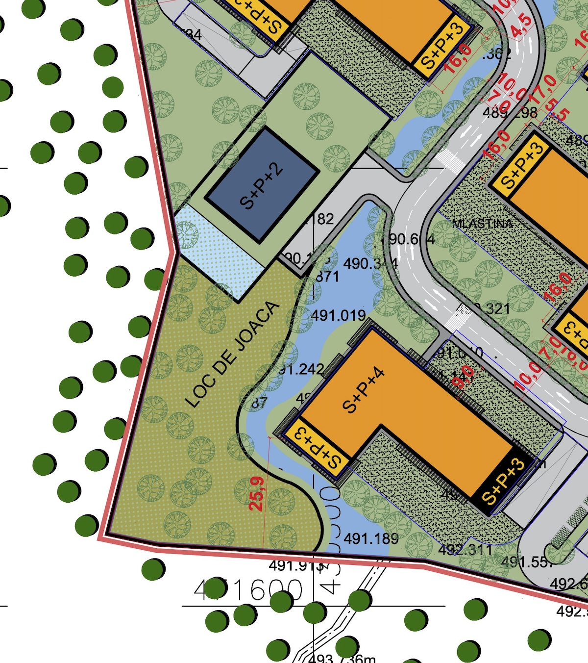 Alături de clădirea propusă pentru grădiniță și afterschool, este prevăzut un spațiu de aproximativ 5.000 de mp pentru un loc de joacă. Sursa foto: detaliu din planșa de mobilare a terenului