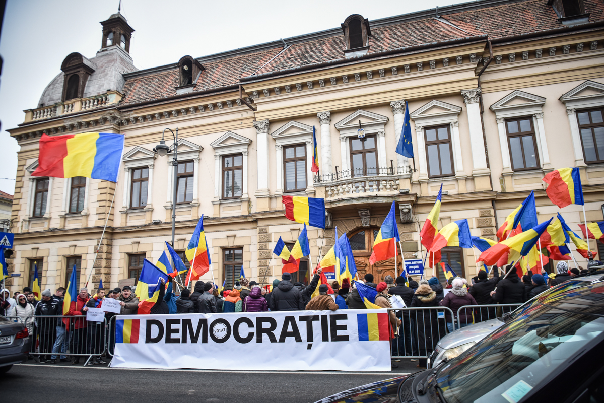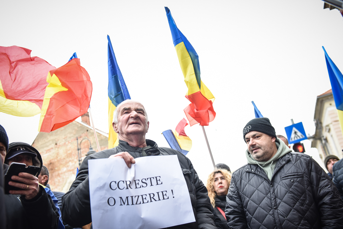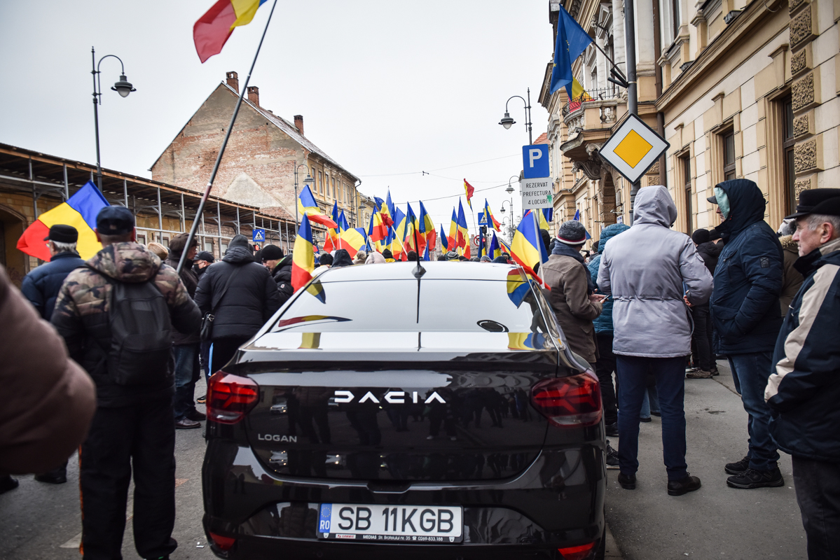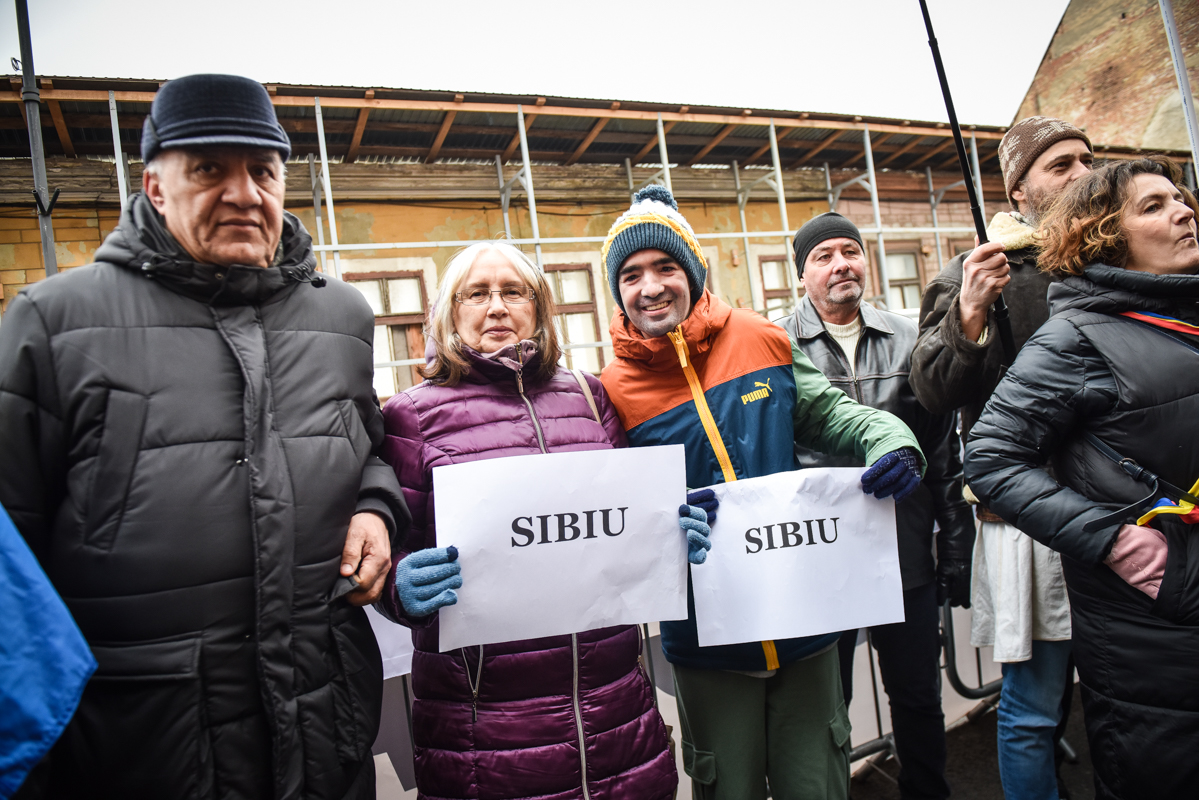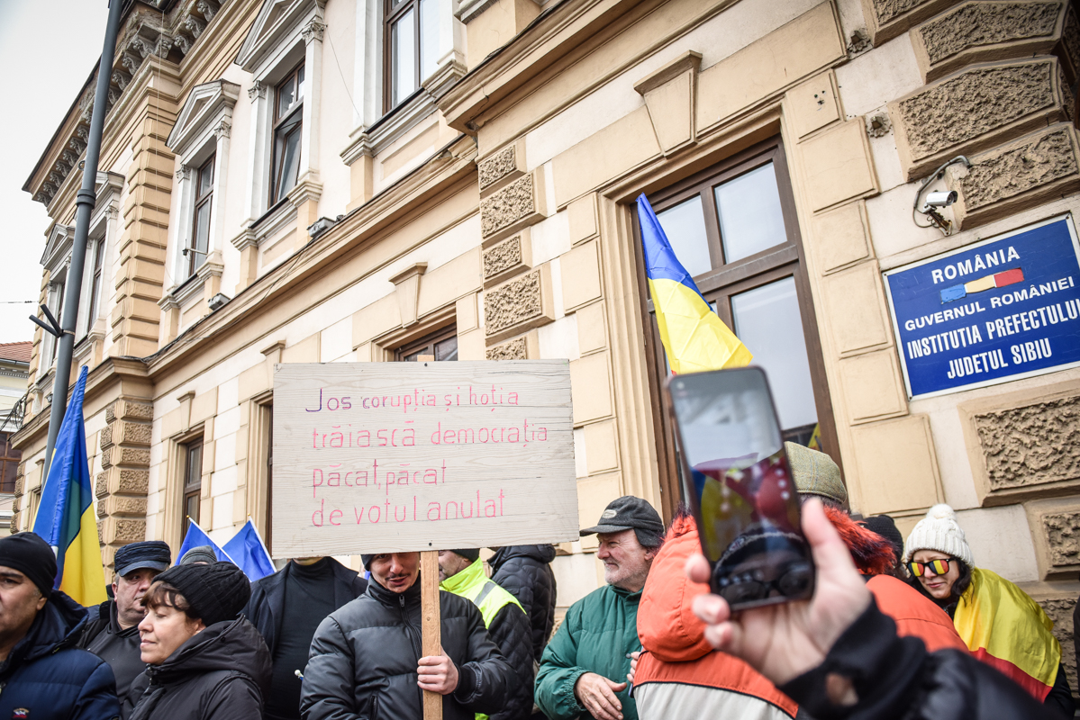 „Nu cedăm, nu renunțăm și nu trădăm. Protestăm pentru alegeri libere, împotriva măsurilor de austeritate și cerem demisia președintelui ilegitim Iohannis!” - sub acest slogan câteva sute de sibieni s-au strâns sâmbătă în fața Prefecturii din Sibiu.