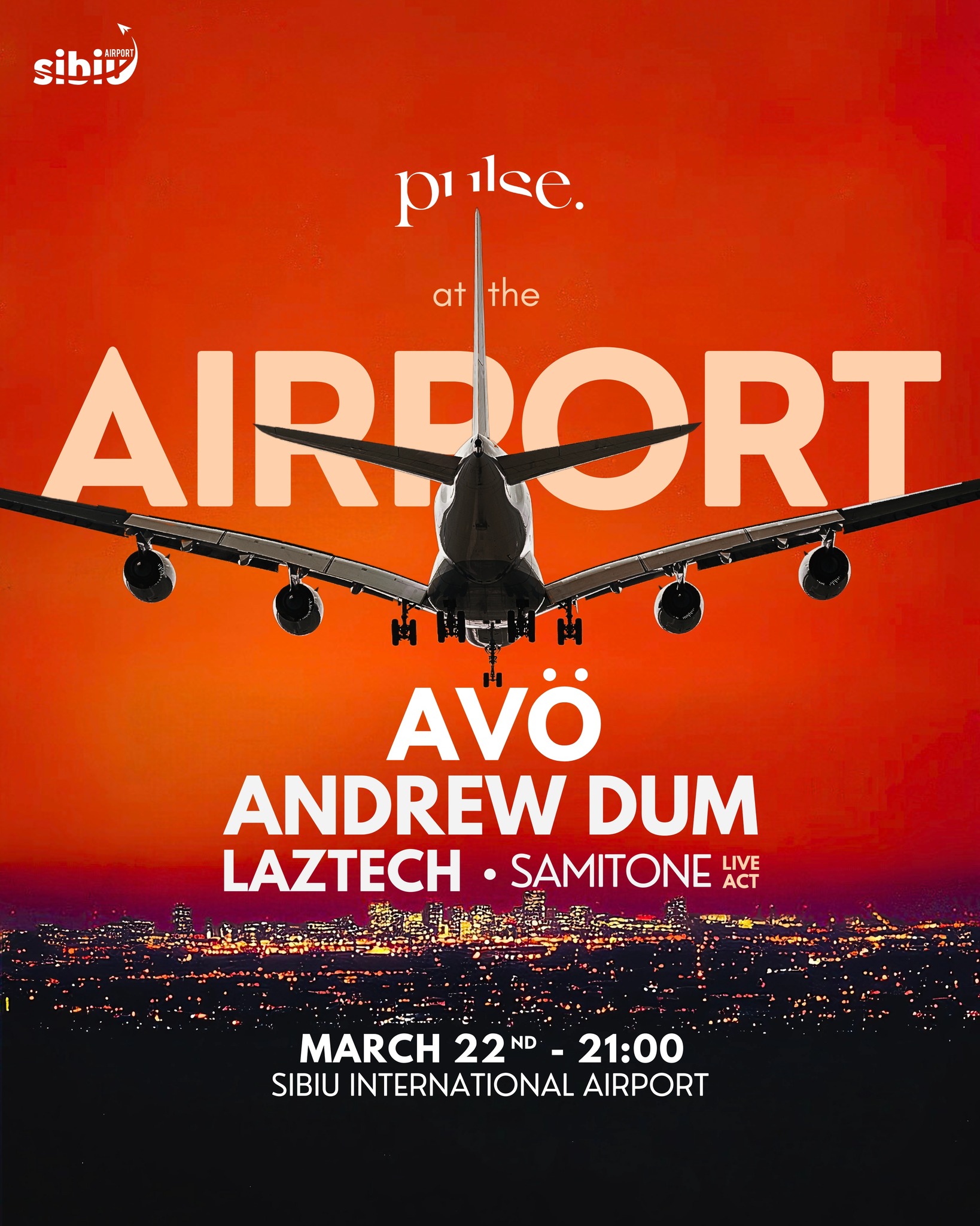 Pe 22 Martie, pulse. Sibiu ne invită la o petrecere care va avea loc la Aeroportul Internațional Sibiu. Line-up-ul este construit din următoarele nume: AVÖ, Andrew Dum, Laztech & Samitone.