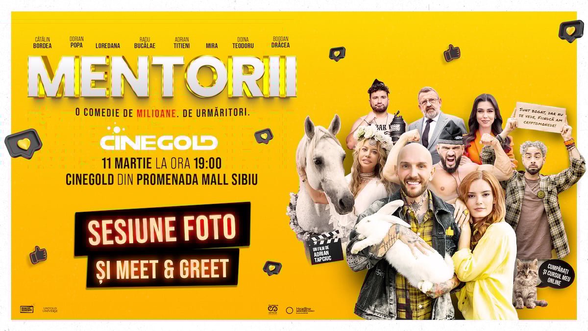 Turneul de promovare al celei mai tari comedii ale momentului, MENTORII, ajunge pe 11 martie la Sibiu. Filmul care a cucerit box office-ul românesc în primul weekend de la lansare, poate fi vizionat în cadrul unei proiecții speciale. Echipa va fi la Cine Gold incepand cu ora 19:00 pentru poze, autografe, interviuri, urmad ca proiectia filmului sa inceapa la ora 20:00. Este o ocazie de neratat pentru fanii comediei să îi întâlnească pe Dorian Popa, Tina Duceac și Silviu Mircescu.