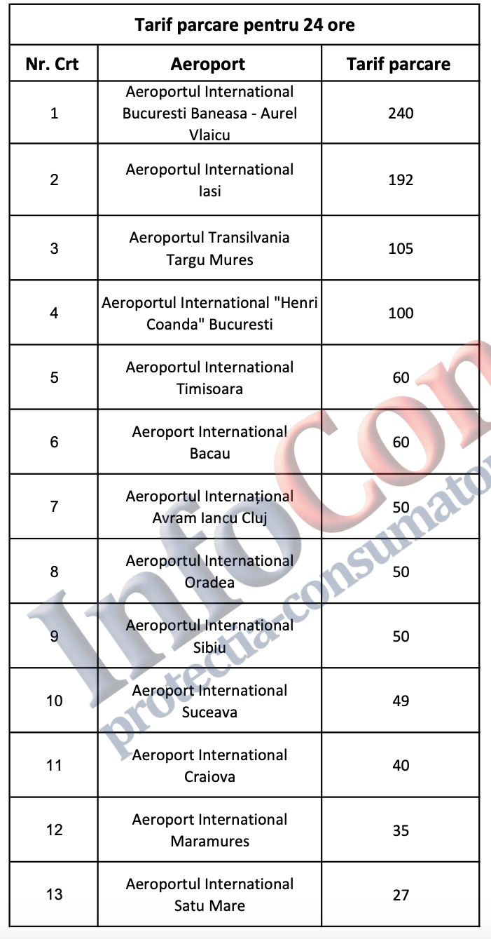 Asociația InfoCons, o organizație pentru protecția consumatorilor, a realizat un studiu comparativ cu privire la tarifele de parcare pe diferitele intervale de timp pentru Aeroporturile Internaționale din România.