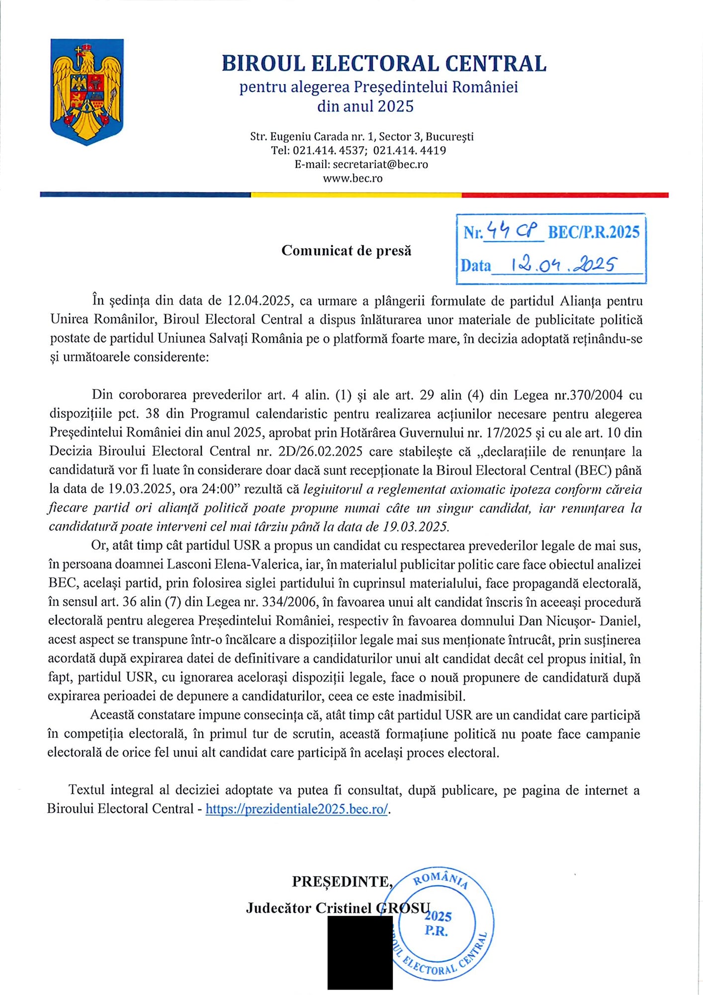 ‘În ședința din data de 12.04.2025, ca urmare a plângerii formulate de partidul Alianța pentru Unirea Românilor, Biroul Electoral Central a dispus înlăturarea unor materiale de publicitate politică postate de partidul Uniunea Salvați România pe o platformă foarte mare’, a anunțat site-ul instituției.