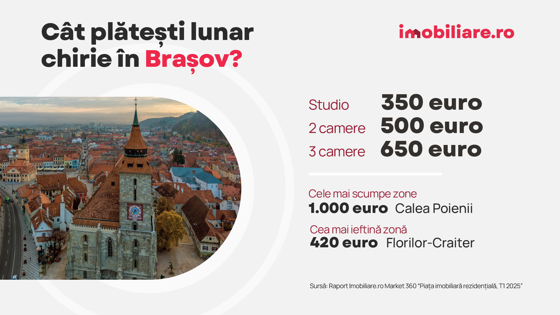Chiria medie solicitată pentru o garsonieră din Brașov a ajuns la 350 euro/lună, iar cea aferentă unui apartament cu 2 camere la 500 euro/lună. Pentru un apartament cu 3 camere un chiriaș trebuie să achite, în medie, 650 de euro lunar.