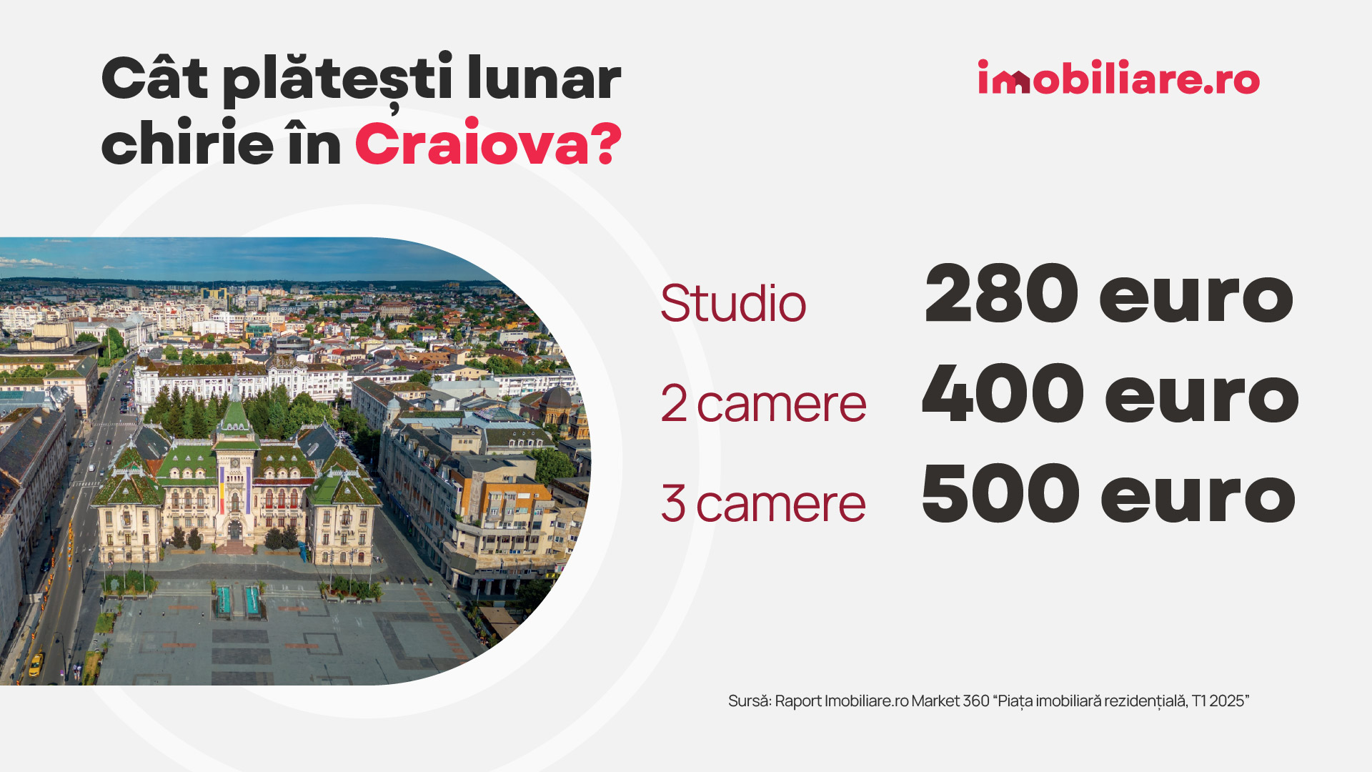 Craiova: Bugetul mediu necesar pentru închirierea unei garsoniere a ajuns la 280 euro/lună, iar cel aferent închirierii unui apartament cu 2 camere la 400 euro/lună. Pentru un apartament cu 3 camere un chiriaș trebuie să scoată lunar din buzunar 500 de euro.