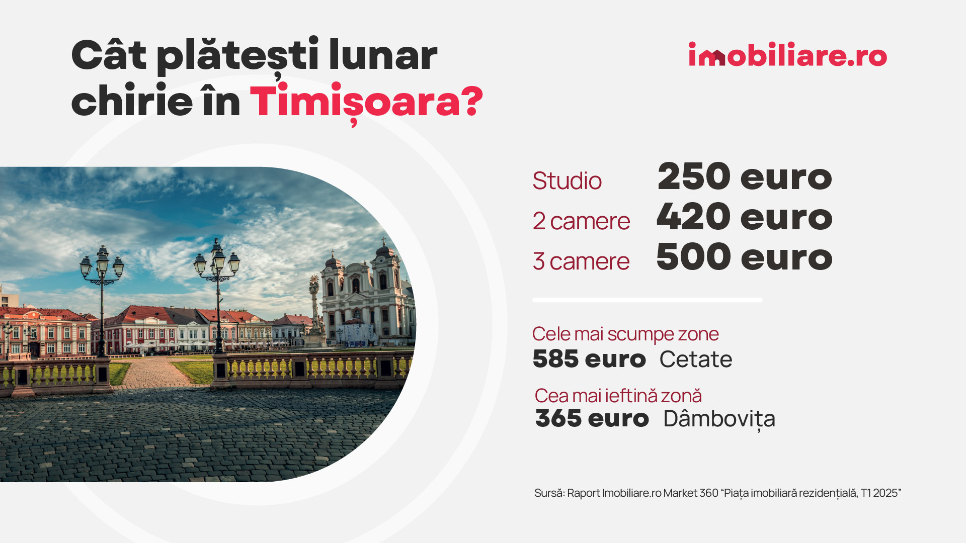 Conform sursei citate, în București ai nevoie de un buget mediu de 360 euro/lună pentru a închiria o garsonieră și de 590 euro/lună pentru un apartament cu 2 camere. În cazul apartamentelor mai spațioase, cu 3 camere, viitorii chiriași trebuie să se aștepte să achite lunar o sumă medie de 850 euro/lună, potrivit Raportului Imobiliare.ro Market 360 “Piața imobiliară rezidențială, T1 2025”.