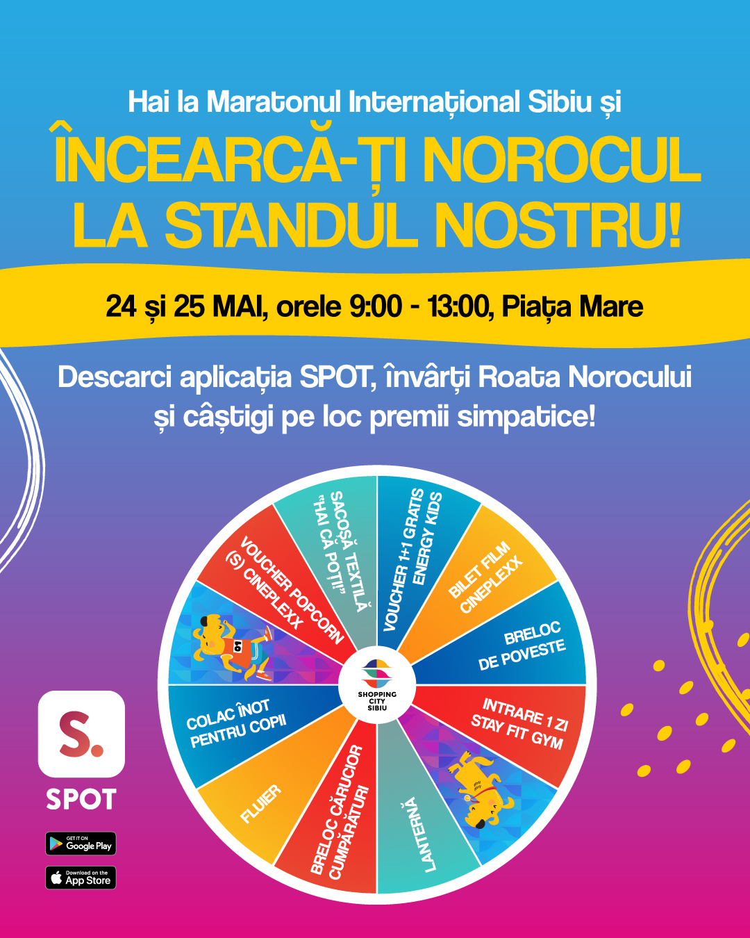 În zilele de 24 și 25 mai, între orele 09:00 și 13:00, Shopping City Sibiu va fi prezent în Piața Mare cu un stand dedicat alergătorilor și vizitatorilor maratonului. Zona va include un spațiu de relaxare și hidratare pentru echipa proprie de alergători, dar și o activare specială SPOT pentru publicul larg, cu jocuri și premii instant oferite prin Roata Norocului.