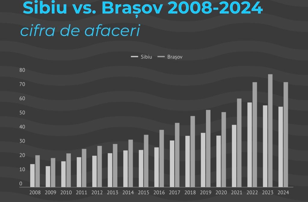 În același an 2023, companiile din Brașov aveau o cifră de afaceri de 79,45 miliarde de lei, un profit de 6,33 de miliarde de lei cu 151 de mii de angajați. Sibiul a avut 57,5 miliarde de lei cifră de afaceri, profit de 6,72 de miliarde și 111 mii de angajați. Fără cele două societăți din Mediaș, Sibiul are avea o cifră de afaceri mai mică cu 10,6 miliarde și un profit mai mic cu 2,76 miliarde de lei.