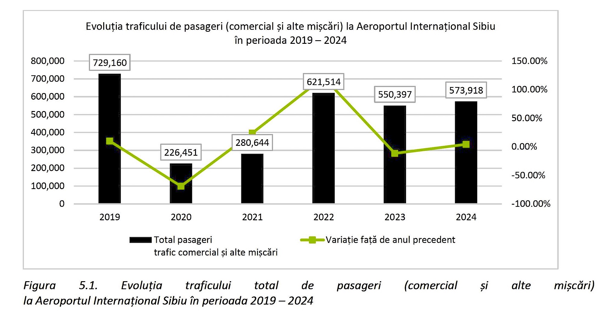 Față de anul de referință 2019, când traficul pe Aeroportul Internațional Sibiu a atins recordul de 729.160 de pasageri, anul trecut numărul total al călătorilor a fost mai mic cu 21,3%.