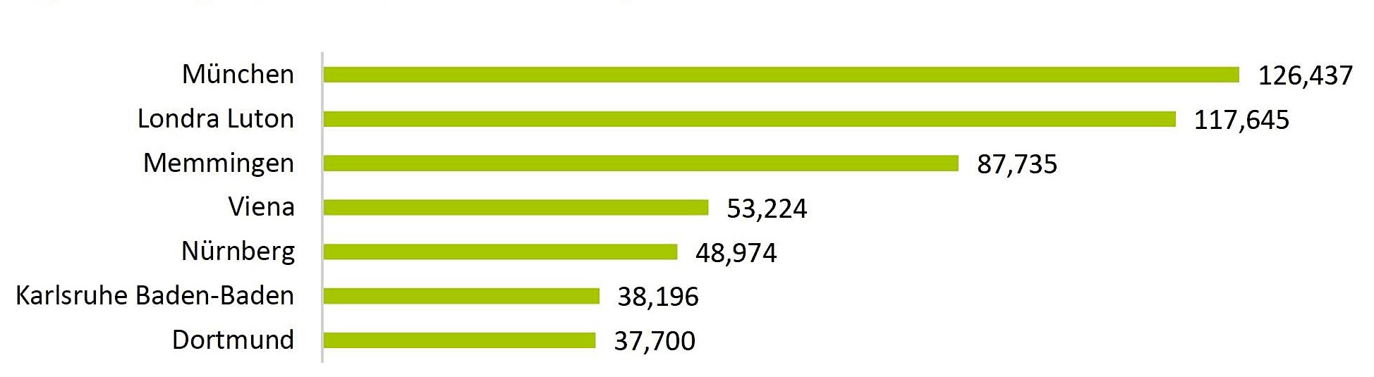 Cea de-a treia rută în ordinea încărcării a fost cea către Memmingem: 87.735 de pasageri au fost numărați în cursul anului 2024 pe această linie operată tot de către Wizz Air.