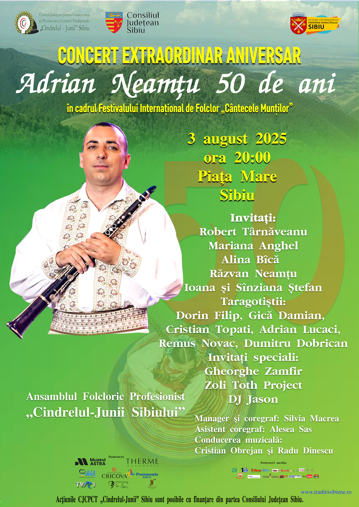 Perioada festivalului culminează cu cele trei seri de spectacole grandioase în Piața Mare din Sibiu, în două dintre aceste seri fiind sărbătoriți artiști reprezentativi ai Sibiului, care și-au legat parcursul de Ansamblul Folcloric Profesionist „Cindrelul-Junii Sibiului”. Astfel, în 1 august, după tradiționala paradă a ansamblurilor participante de pe bulevardul Nicolae Bălcescu, Codruța Rodean și Bogdan Cioranu vor fi protagoniștii unei seri de poveste. Povestea lor, a cântecului pastoral, este îmbrățișată de artiști din întreaga țară, de Junii Sibiului și de invitatul special, Ștefan Bănică Jr. Duminică, 3 august, taragotistul Adrian Neamțu va fi cel în jurul căruia se va desfășura întregul spectacol, celebrând cei 50 de ani de viață ai artistului. Îi vor fi alături și alți taragotiști renumiți, colegi și colaboratori, fiul său, Răzvan Neamțu, Zoli Toth Project, dar și marele naist Gheorghe Zamfir.