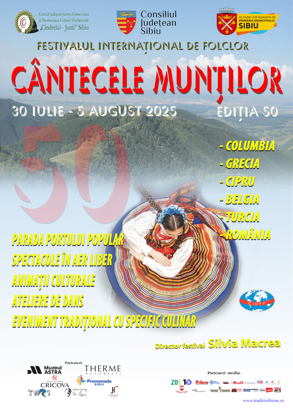 Festivalul Internațional de Folclor CÂNTECELE MUNȚILOR serbează o jumătate de secol de promovare a diversității culturale și a frumosului. Ajuns la cea de-a 50-a ediție, acest festival propune publicului cinci zile de spectacole, ateliere de dans, proiecție de film, seară culinară tradițională și animații culturale, în diverse spații neconvenționale ale Sibiului.