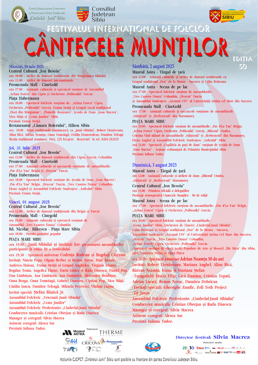„În zilele în care cultura este privită, din păcate, ca un lux neimportant în contextul dificultăților financiare prin care trece țara, trebuie trebuie să ne amintim că tocmai cultura este cea care ne unește, cea care aduce lumină în sufletele oamenilor. Mă bucur că putem oferi publicului spectacole speciale, mai ales acum, când aniversăm 50 de ediții frumoase ale Festivalului Internațional de Folclor „Cântecele Munților. Cinci decenii în care spectatorii s-au bucurat de frumusețea și energia folclorului românesc și internațional, în Sibiu – un oraș în care tradiția și diversitatea culturală continuă să vibreze în inima comunității.” a declarat Silvia Macrea, manager al Centrului Județean pentru Conservarea și Promovarea Culturii Tradiționale „Cindrelul-Junii” Sibiu.