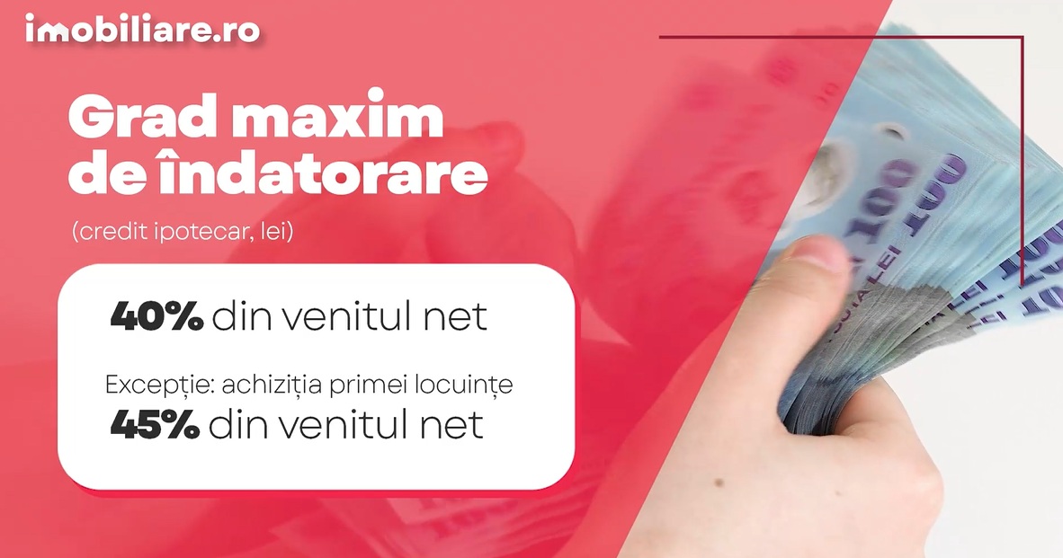 Dacă ești la prima achiziție, gradul de îndatorare acceptat este de maximum 45% din venit. Pentru a doua locuință, procentul scade la 40%.