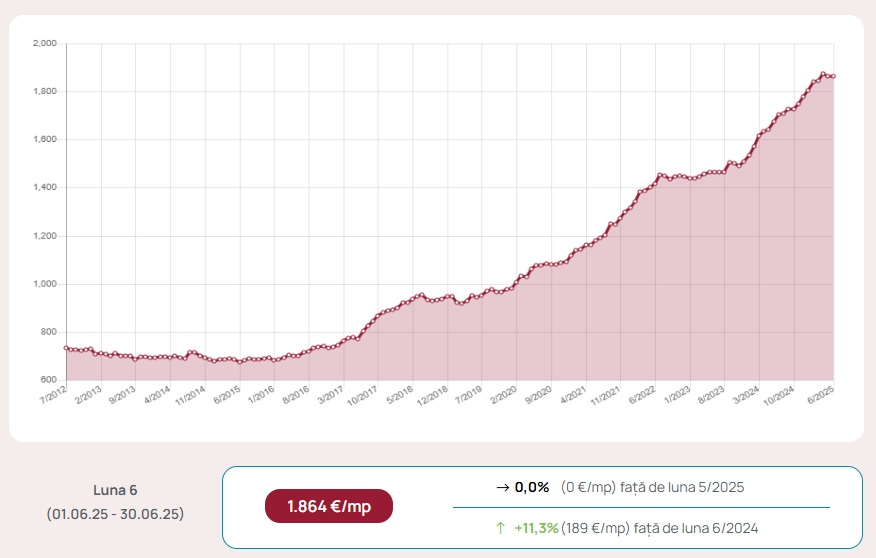 În iunie, media cerută de vânzători a fost de 1.864 euro/mp, la fel ca în luna anterioară, dar cu peste 11% mai mult față de anul trecut.