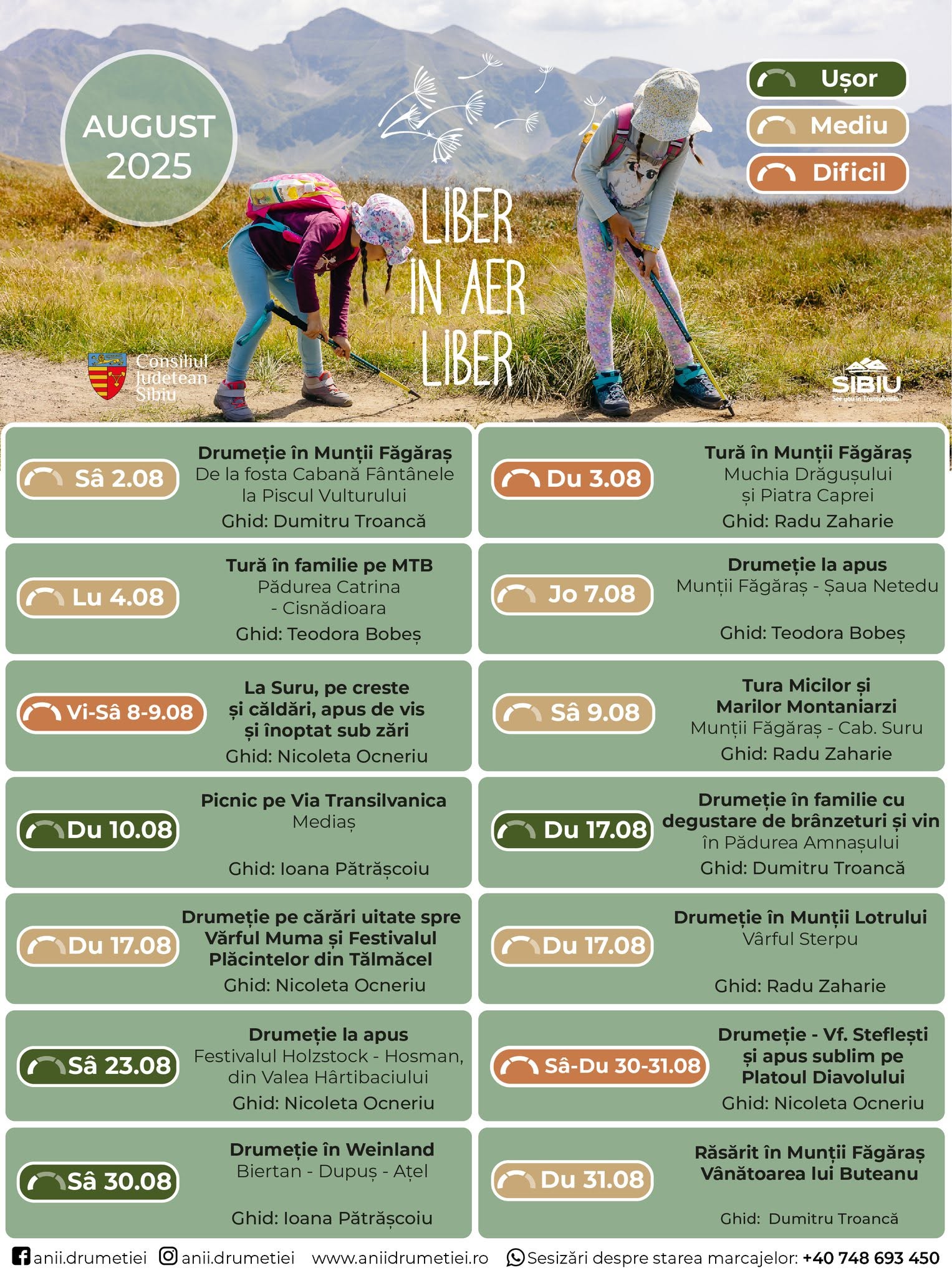 În fiecare weekend, cei de la Anii Drumeției au pregătit un program special cu drumeții. Atașăm mai jos programul din ultima lună de vară.