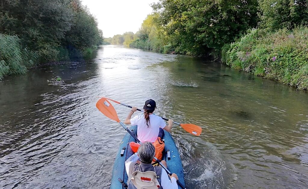 A vâsli pe Cibinul din intravilanul orașului a fost, însă, un pic mai dificil decât am bănuit. Am coborât din barcă de mai bine de cinci ori din cauza nivelului scăzut al apei, ceva timp ne-a luat și până am învățat (dar n-am reușit nici la final să stăpânim secretul) să ne sincronizăm vâslitul pe un caiac fără aripioare de ghidaj dedesubt, astfel că abia pe la nouă fără un sfert treceam pe sub podul drumului care duce din Sibiu către Agnita. Punctul acesta este relevant deoarece de acolo începe, practic, Cibinul fermecător: e frumos să vâslești, de exemplu, și pe porțiunea din dreptul străzii Podului din cartierul Gușterița, malurile sunt curate, vegetație este din plin, dar abia după ce ieși din intravilan îți dai seama cât de gălăgios este, de fapt, orașul.
