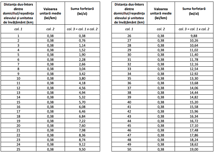 Astfel, suma forfetară zilnică este calculată pe baza distanței dus-întors dintre domiciliul elevului și unitatea de învățământ: