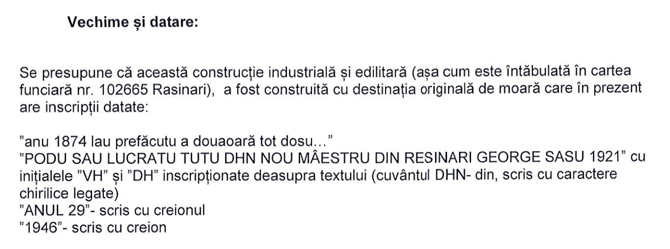 Clădirea este proprietatea comunei, iar lucrările de renovare sunt estimate la 296.160 lei fără TVA. Conform caietului de sarcini, este o construcție despre care se presupune că a fost construită cu destinația originală de moară. Are inscripții datate din anii 1874, 1921, 1929 și 1946, inclusiv e menționat un meșter din Rășinari, George Sasu, în 1921. Moara păstrează elemente valoroase precum grinda planșeu cu inscripții, sistemul morii și pietrele de moară, tâmplăria originală a ferestrelor și un arc de lemn deasupra intrării principale.