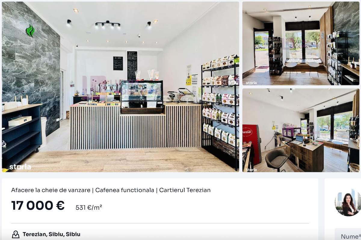 Conform anunțului, cafeneaua funcționează într-un spațiu de 32 mp cu vitrină la strada Lungă și se vinde complet utilată – de la espressor și râșniță până la vitrină frigorifică și stocuri de marfă. Prețul cerut este de 17.000 de euro.