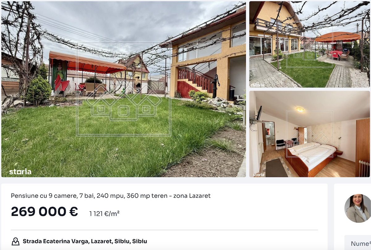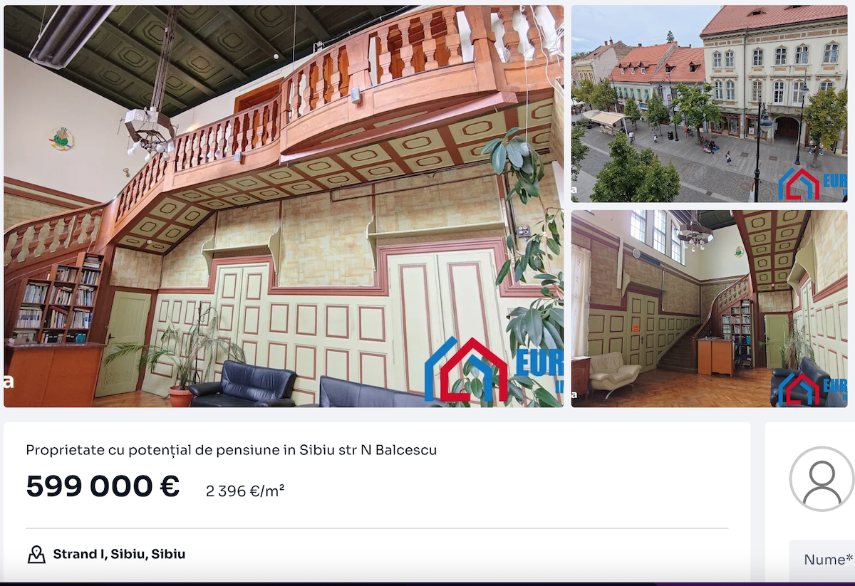 Tot la capitolul clădiri, în inima Sibiului, pe principala arteră pietonală, se vinde o clădire cu 11 camere și 11 băi. Agentul de vânzări afirmă că aceasta are potențial de pensiune, adică e pregătită să funcționeze în regim hotelier. Suprafața utilă este de aproximativ 250 mp, imobilul este dispus pe 3 niveluri, iar anunțul menționează îmbunătățiri precum scări interioare sau instalații termice moderne.