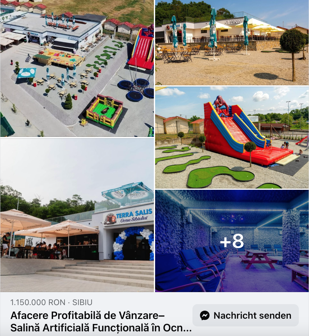 Un alt tip de afacere de vânzare găsim la Ocna Sibiului. Terra Salis este o salină artificială inaugurată la începutul verii, iar acum este scoasă la vânzare pentru 1.150.000 de euro. Proprietarul ne-a spus direct: „Nu mai am timp să mă ocup de ea”.