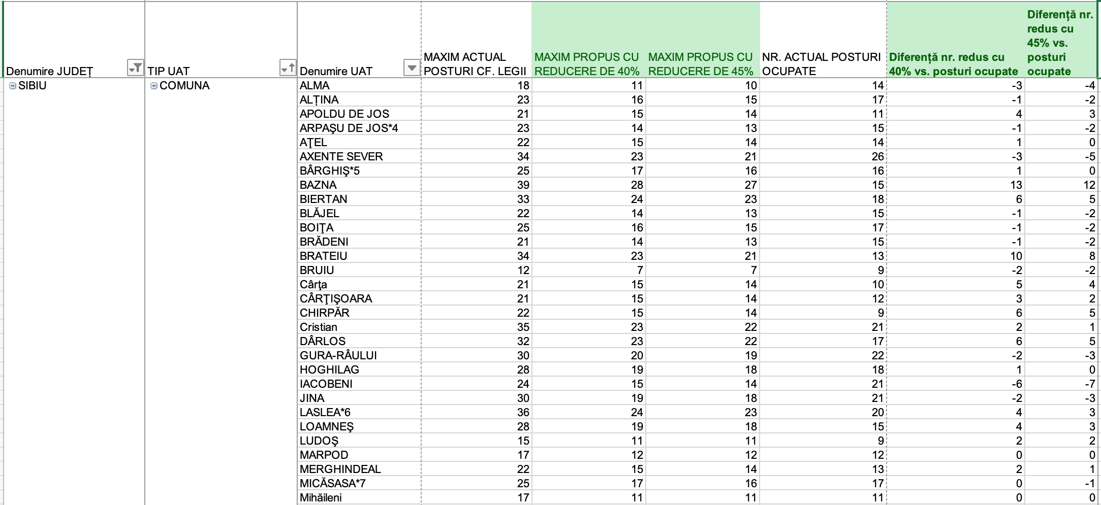 Din acest motiv, am propus să facem o analiză cât se poate de corectă și de cinstită asupra administrației locale din România. În această după-amiază veți avea un link în care toate aceste calcule vor fi publice și se va vedea pe fiecare județ din România și pe fiecare localitate din România care e numărul maxim de posturi aprobate, care ar fi simulările de reducere de personal și pe ultima coloană veți vedea cine are personal în plus și va trebui să facă reduceri, dacă se va aproba proiectul, și câte administrații are personalul calculat corect și nu trebuie să facă nimic.