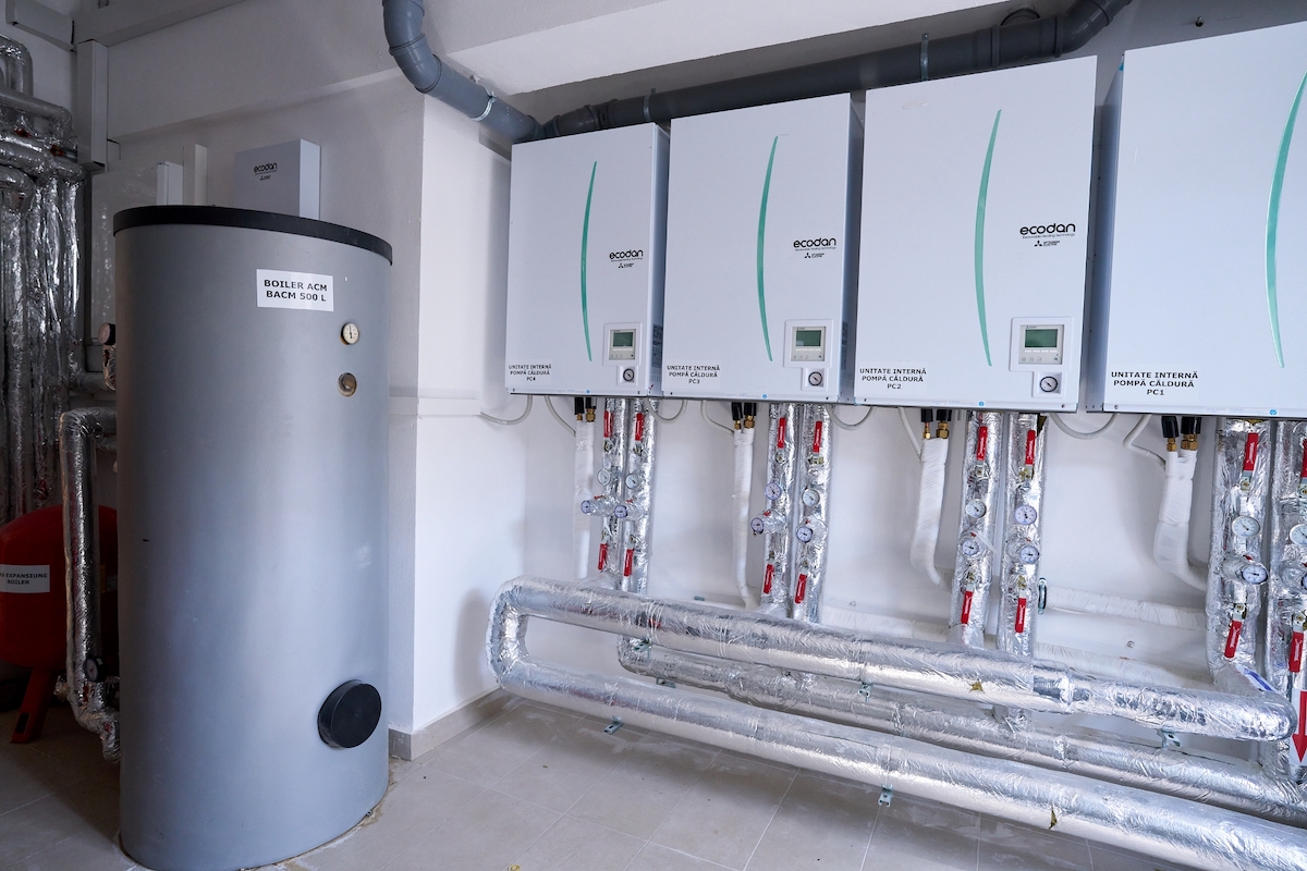 Încălzirea clădirii este și aceasta mai eficientă, făcându-se prin sisteme moderne - pompe aer-apă.